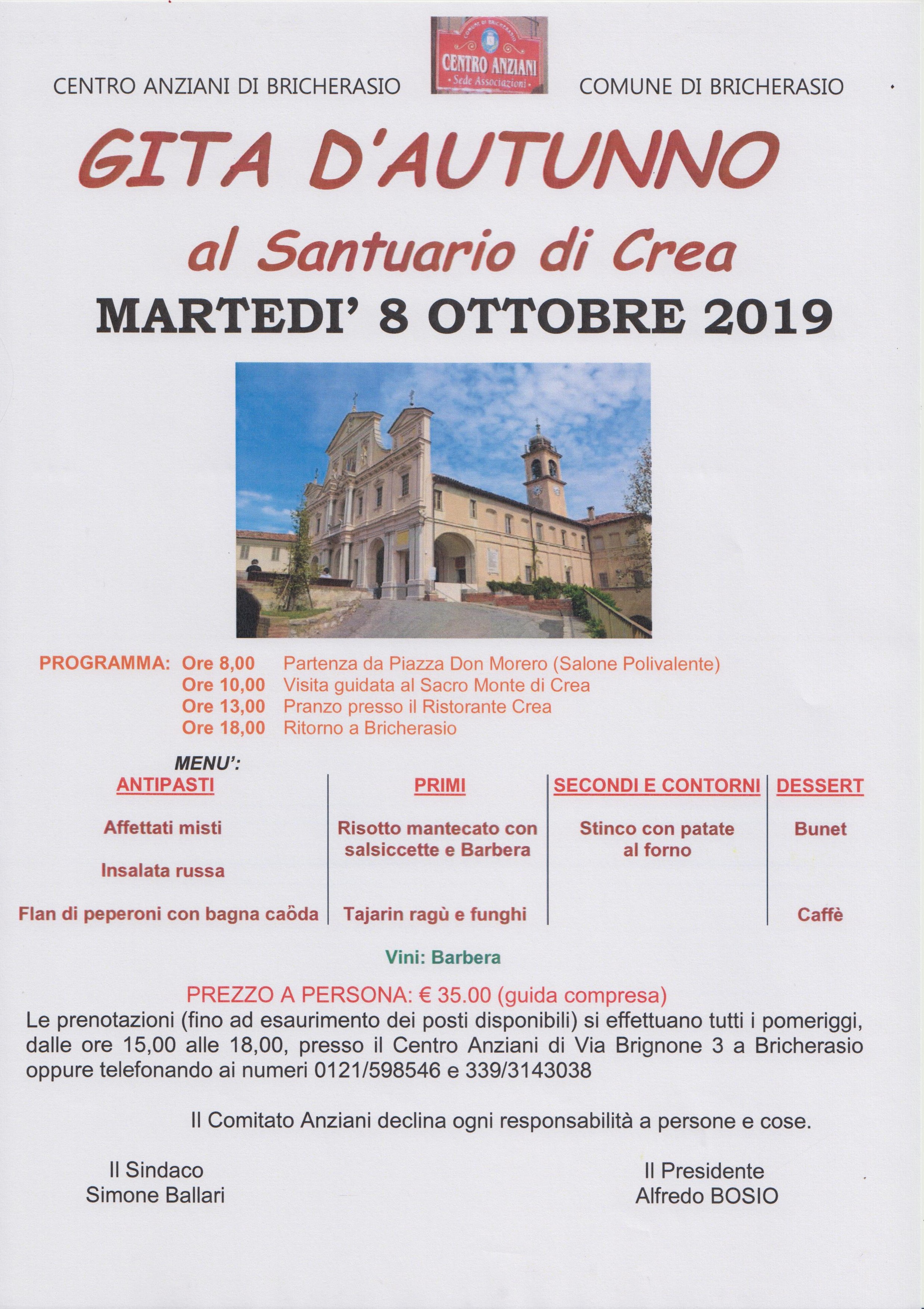 Il Centro Anziani di Bricherasio organizza, in collaborazione con il Comune l’immancabile gita d’autunno per martedì 8 ottobre al Santuario di Crea. Il programma prevede alle ore 8,00 la partenza da Piazza Don Morero. Alle 10,00 la visita al Sacro Monte di Crea. Alle 12,30 il pranzo al ristorante “Crea”. Alle 18,00 partenza per il rientro a Bricherasio. Il costo della gita a persona è di 35 €. Per informazioni e prenotazioni sino ad esaurimento dei posti, rivolgersi tutti i pomeriggi, dalle ore 15,00 alle 18,00, presso il Centro Anziani di Via Brignone, 3 a Bricherasio oppure telefonando al 339/3143038 e al numero 0121/598546.