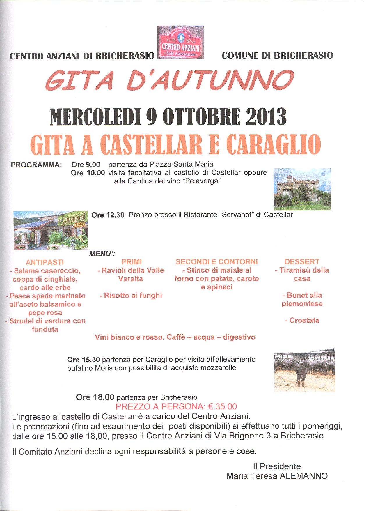 Il Centro Anziani di Bricherasio organizza, in collaborazione con il Comune la consueta gita d’autunno per mercoledì 9 ottobre a Castellar e Caraglio. Il programma prevede alle ore 9,00 la partenza da Piazza Santa Maria. Alle 10,00 l’arrivo previsto a Castellar per la visita all’omonimo castello oppure alla Cantina del vino “Pelaverga”. L’ingresso al castello è a carico del Centro Anziani. Alle 12,30 pranzo presso il ristorante “Servanot” di Castellar con un ricco menù. La partenza per la visita all’allevamento bufalino “Moris” di Caraglio con possibilità di acquisto di mozzarelle e per le ore 15,30. Alle 18,00 partenza per Bricherasio. Per informazioni e prenotazioni sino ad esaurimento dei posti, rivolgersi tutti i pomeriggi, dalle ore 15,00 alle 18,00, presso il Centro Anziani di Via Brignone, 3 a Bricherasio.