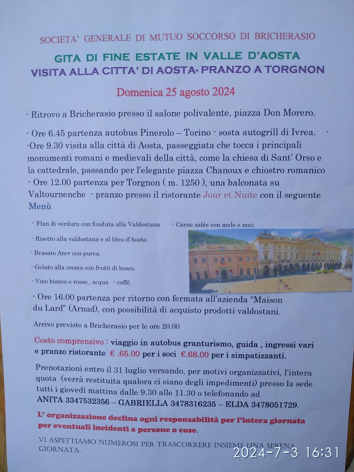 Il direttivo della Società di Mutuo Soccorso di Bricherasio organizza la gita di fine estate in Valle d’Aosta, domenica 25 agosto. La partenza è prevista dal Salone Polivalente di Piazza Don Morero a Bricherasio per le ore 6,45. L’inizio della visita alla città di Aosta è previsto alle ore 9,30 mentre alle ore 12 il gruppo si reca a Torgnon per il pranzo al Ristorante Jour e Nuite. Alle ore 16 partenza per il rientro a Bricherasio, con fermata all'Azienda "Maison du Lard" ad Arnad con possibilità di acquistare prodotti valdostani. Il costo del viaggio che comprende autobus, pranzo, ingressi e guide è di 65 € per i soci e di 68 € per familiari e simpatizzanti. Prenotazioni fino ad esaurimento dei posti disponibili entro mercoledì 31 luglio versando, per motivi organizzativi, l’intera quota di partecipazione alla sede della Società bricherasiese, in Via Brignone, il giovedì mattina dalle ore 9,30 alle 11,30 oppure rivolgendosi ad Anita Ghirardi 3347532356, a Gabriella Pons al 3478316235 oppure Elda Rolfo al 3478051729.