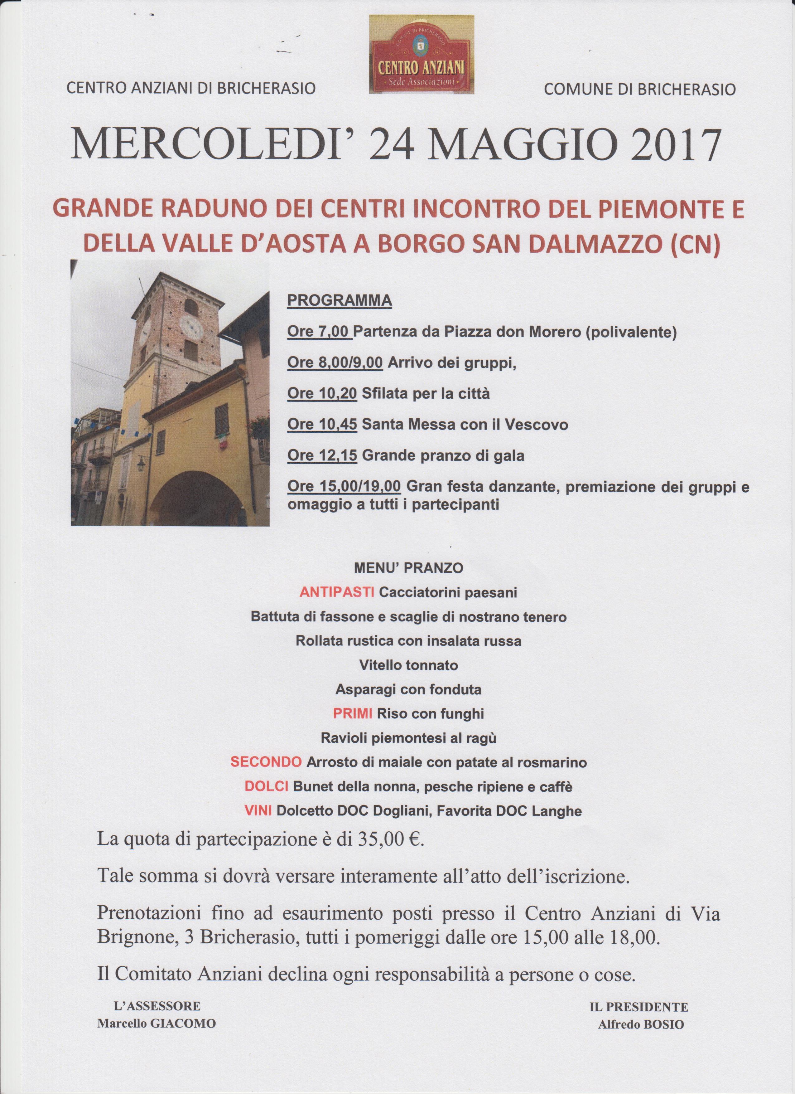 Il Centro Anziani di Bricherasio organizza, in occasione del grande raduno regionale dei Centri d’incontro del Piemonte e della Val d’Aosta, una gita a Borgo San Dalmazzo per mercoledì 24 maggio. Il programma prevede la partenza da Piazza Santa Maria a Bricherasio alle ore 7,00 con arrivo ed accoglienza dei partecipanti dalle 8,00 alle 9,00 al quale segue la sfilata per le via della città cuneese e la Santa Messa celebrata dal Vescovo. Alle 12,15 il grande pranzo di gala con cinque antipasti, due primi piatti e l’arrosto di maiale con patate di secondo e contorni. Chiudono il bunet della nonna e le pesche ripiene e il caffè. Nel pomeriggio fino alle ore 19 festa danzante e premiazione dei gruppi con omaggio a tutti i partecipanti. La quota di partecipazione è fissata in 35 € e le prenotazioni si effettuano, fino ad esaurimento posti, presso il Centro Anziani di Via Brignone, 3 a Bricherasio tutti i pomeriggi dalle 15 alle 18 fino ad esaurimento dei posti disponibili.