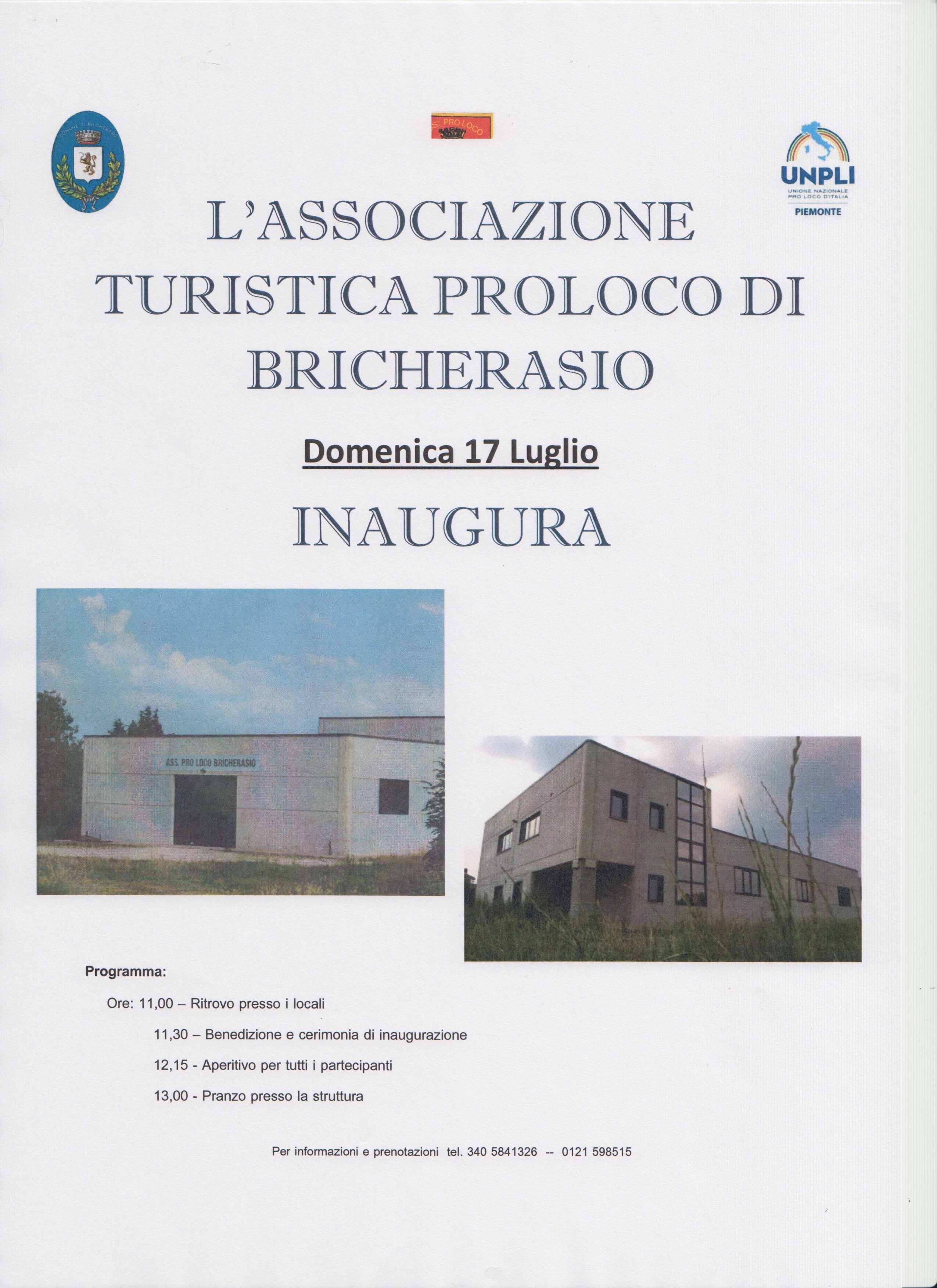 Alla presenza di Autorità comunali, dei volontari della Pro Loco di Bricherasio e dei cittadini, Domenica 17 luglio alle ore 11,30 viene inaugurato il nuovo magazzino della locale Associazione turistica Pro Loco. Seguiranno la benedizione impartita da don Ferdi e il pranzo all’interno della nuova struttura che ospiterà la sede, gli uffici, una cucina e un ampio salone. Olio di gomito, forza di volontà: questo è il motivo d’orgoglio del Presidente Morero Severino e dello staff dell’Associazione che è riuscita nell’impresa di costruire il prezioso magazzino senza contributi esterni. Gli oltre 200 soci hanno duramente lavorato per avere un magazzino di proprietà. Le attività iniziate nel 2012 vedranno la luce domenica prossima con l’inaugurazione ufficiale della sede di fianco al Salone Polivalente in Piazza Don Morero. L’associazione ha compiuto 42 anni, è stata fondata nel 1974 da un gruppo di volenterosi che cercavano di supplire alla mancanza del comitato festeggiamenti scioltosi precedentemente. La costituzione dell'atto porta la firma dei Sigg. Claudio Bonansea, Aldo Fassino, Franco Ramallo Bocco, Franco Falco e Morero Emilio con l'obiettivo principale di promuovere ed incentivare il turismo, creare momenti di aggregazione, al fine di tramandare gli usi e i costumi di Bricherasio, far scoprire ai numerosi turisti che affluiscono durante le manifestazioni le tradizioni e i prodotti, non dimenticandosi la solidarietà verso chi sta attraversando momenti di difficoltà, o iniziative per la raccolta fondi per il restauro delle numerose opere che esistono nel nostro bel paese. Per raggiungere l’obiettivo la Pro Loco organizza sagre, feste, serate teatrali, giochi sportivi, spettacoli musicali, e momenti conviviali a tema o in occasioni particolari.