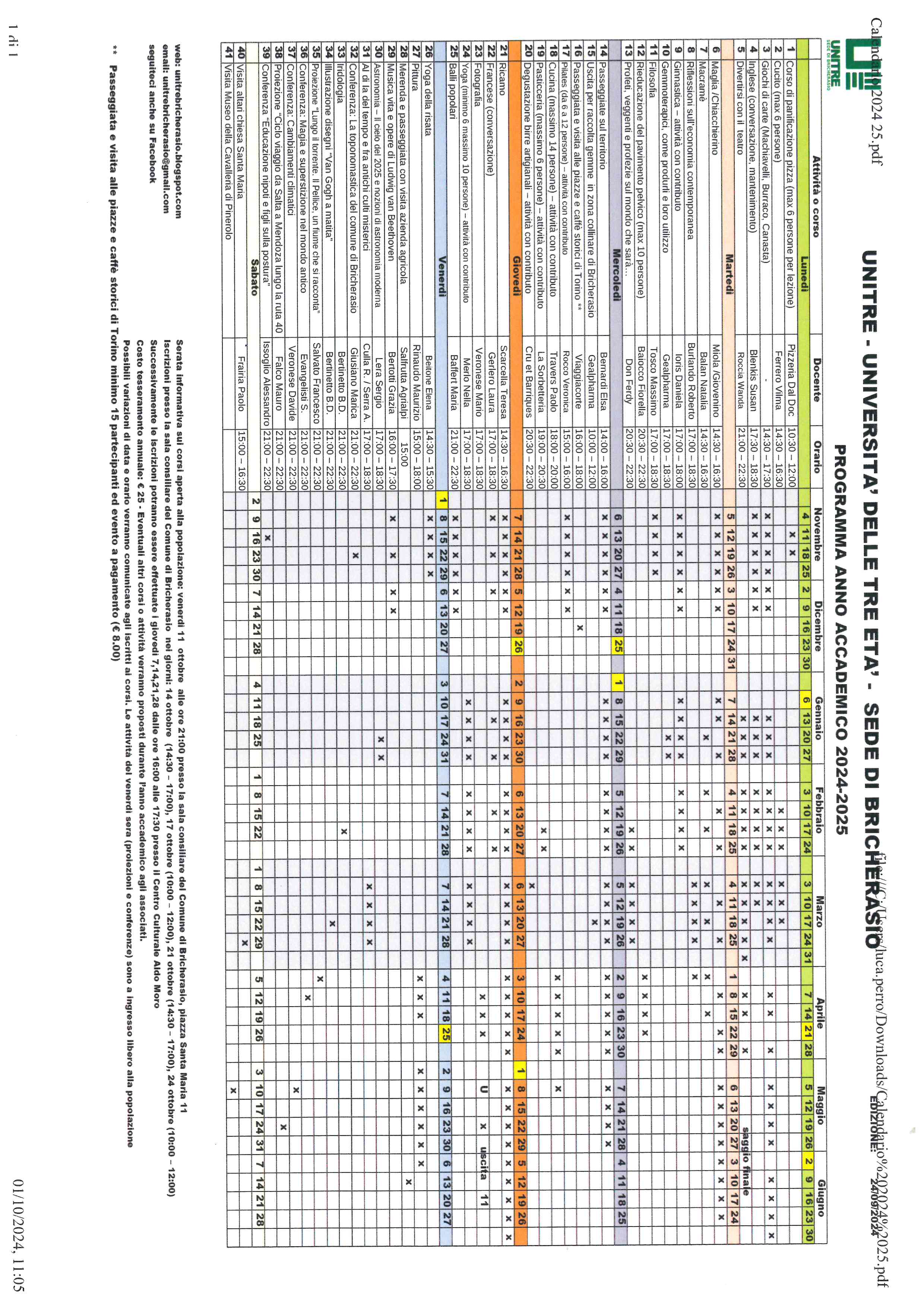 Giovedì 24 ottobre dalle ore 10 alle 12:00 ultimo giorno per le iscrizioni nella Sala Consigliare del Comune di Bricherasio al ricco programma dell’anno accademico 2024/25 dell'Unitre bricherasiese. Successivamente le adesioni potranno essere effettuate i giovedì del mese di novembre dalle 16 alle 17,30 al Centro Culturale “Aldo Moro”, di Via Vittorio Emanuele II, 79/B sede della maggior parte dei corsi. Il costo del tesseramento annuale è di € 25 e da diritto a frequentare tutti i corsi (salvo raggiungimento limite massimo per quelli specificati) e le conferenze del venerdì, aperte anche alla popolazione. La sede di Bricherasio dell’Università delle tre età ha cercato di non creare sovrapposizioni tra più corsi, anche se alcune si sono rese necessarie e si chiede quindi di porre attenzione agli orari di effettuazione dei corsi di interesse dei partecipanti. In caso di iscrizione ad un corso a numero chiuso e successiva impossibilità da parte degli iscritti alla partecipazione, si invitano tutti a comunicare prontamente la disdetta, in quanto devono subentrare eventuali persone in lista di attesa. Anche l’impossibilità di partecipazione agli altri corsi dovrebbe essere comunicata, in quanto i docenti possono avere la necessità di conoscere il numero degli iscritti per preparare la lezione, oppure è utile conoscere quanti sono i partecipanti nel caso di produzione di dispense o materiale didattico. La sede di Bricherasio offre svariate materie che si “studiano” dal lunedì al venerdì mentre il sabato è dedicato alle visite e gite. I corsi che iniziano ancora di quest’anno sono Conversazione di Inglese, Maglia e Chiaccherino, Filosofia, Ricamo, Conversazione di Francese, Balli popolari, Yoga della risata, Giochi di carte, Panificazione pizza e Musica con vita e opere di Beethoween che si svolgono al Centro Culturale “Aldo Moro”, da dove partono le passeggiate per il paese. Nella sala della Società di Mutuo Soccorso in Via Brignone, si tengono le lezioni di Ginnastica mentre a Casa Ruth in via Bell Ville si svollge il Pilates. Previste alcune uscite sul territorio come la visita alle piazze ed i caffè di Torino e le confereanze sull’Educazione della postura di figli e nipoti e quella sulla toponomastica del Comune di Bricherasio. Per ogni informazione o comunicazione, si deve utilizzare l’indirizzo email unitrebricherasio@gmail.com oppure si può contattare il responsabile del corso o un componente del direttivo. Inoltre gli aggiornamenti si possono reperire sia sul sito web: unitrebricherasio.blogspot.com oppure sulla pagina facebook dell’Unitre.