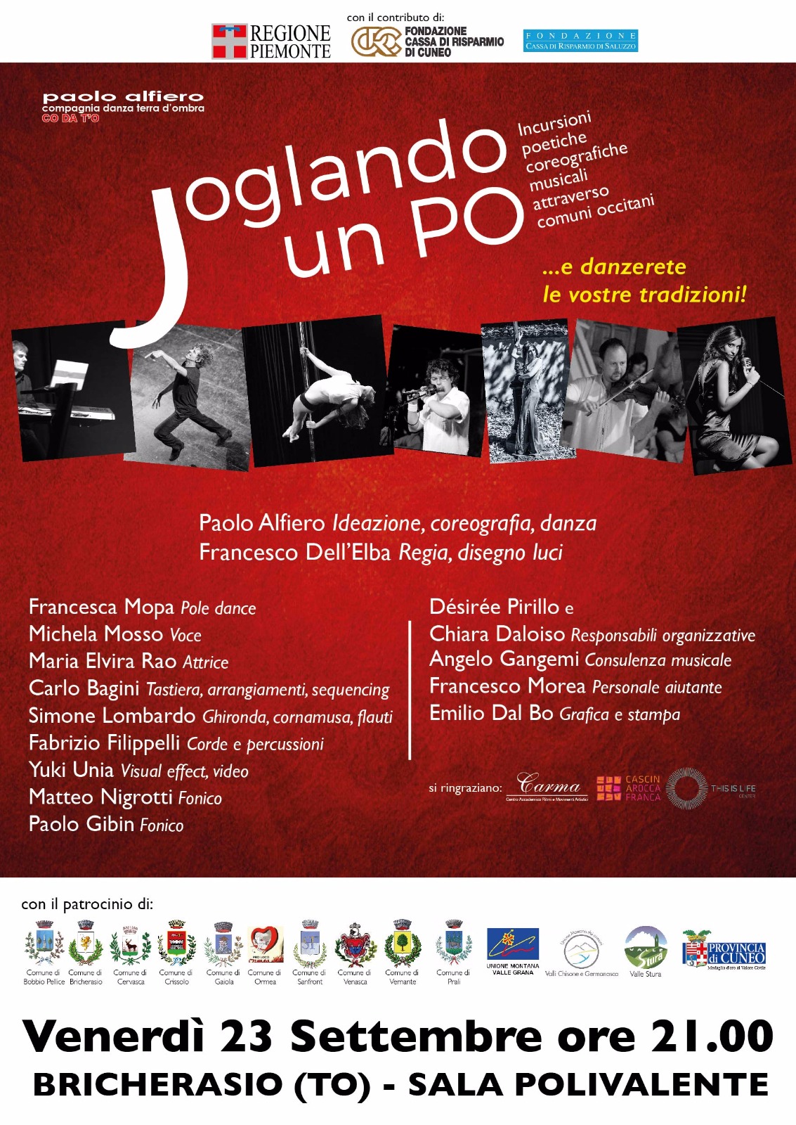 Venerdì 23/9 ore 21.00 presso il salone polivalente di Bricherasio la compagnia danza Terradombra di Torino propone "Joglando un Po", incursioni poetiche, acrobatiche, coreografiche e musicali attraverso comuni occitani e dintorni. Ideazione e coreografie a cura di Paolo Alfiero, regia di Francesco Dell'Elba. Ingresso libero.