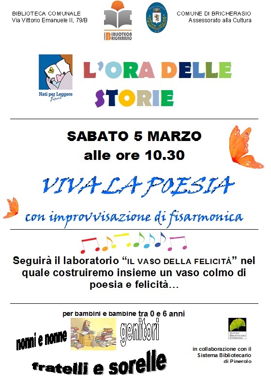 Sabato 5 marzo alle ore 10,30 in biblioteca (Via Vittorio Emanuele II, 97), "L'ora delle storie" presenta "Viva la poesia," con improvvisazione di fisarmonica. Segue il laboratorio "Il vaso della felicità" nel quale si costruirà insieme un vaso colmo di poesia e felicità.