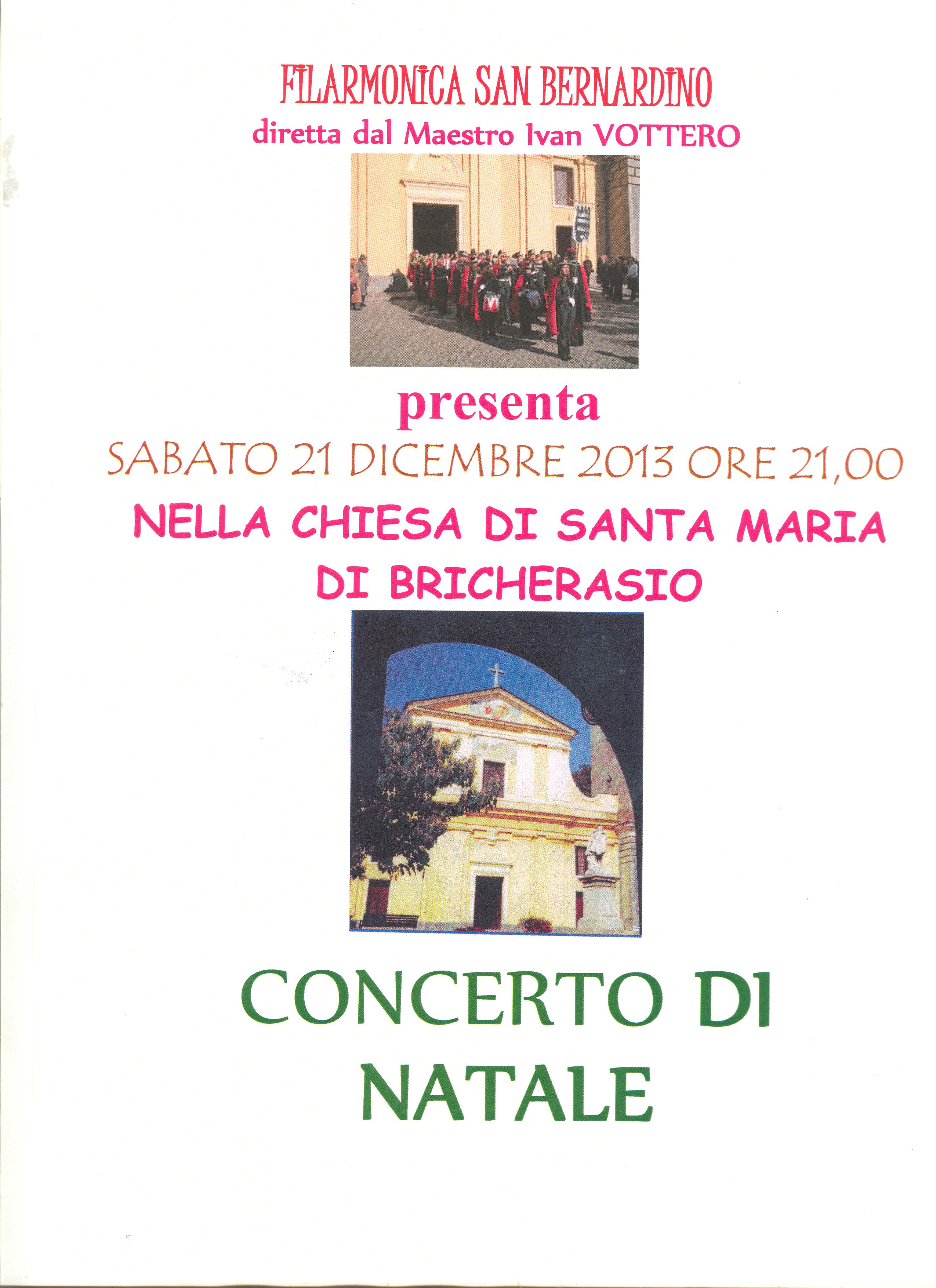 La Filarmonica San Bernardino di Bricherasio organizza per le ore 21,00 di sabato 21 dicembre il tradizionale concerto di fine anno, diretto dal Maestro Ivan Vottero e l’appuntamento si svolge come tradizione presso la Chiesa Parrocchiale di “Santa Maria”.