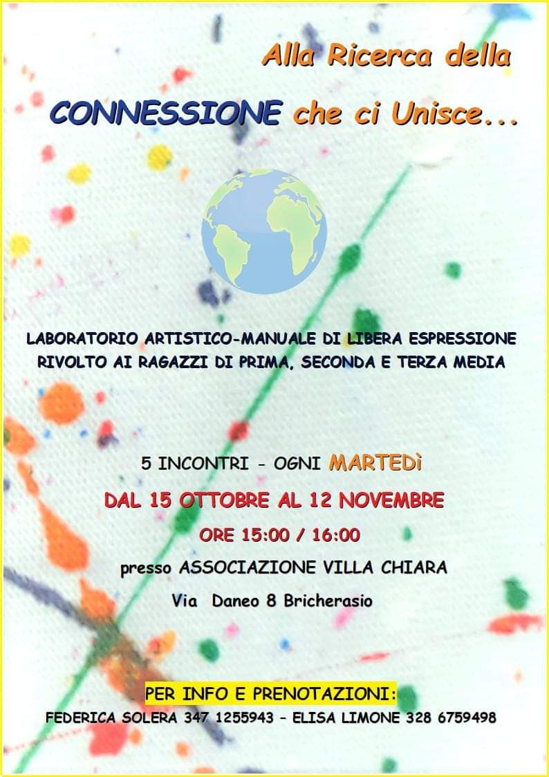 L'Associazione Villa Chiara di Bricherasio organizza nella propria sede in Via Daneo, 8 a Bricherasio cinque incontri di martedì con tema “Alla ricerca della connessione che ci unisce”. Tra le attività proposte quest’anno comincia martedì 15 ottobre, dalle ore 15 alle 16, il laboratorio artistico manuale di libera espressione rivolto ai ragazzi delle scuole medie. Per maggiori informazioni e prenotazioni contattare Federica al 347/1255943 oppure Elisa al numero 328/6759498.