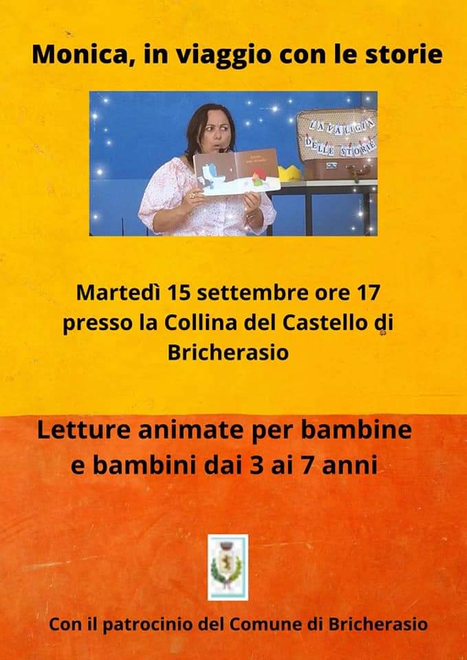 È tempo di incontrare tutti gli amanti delle belle storie per leggerle ed ascoltarle all'aperto, nella piacevole cornice della Collina del Castello nella giornata di martedì 15 settembre dalle ore 17 Monica, con il patrocinio del Comune di Bricherasio, racconta letture animate per bambini e bambine dai 3 ai 7 anni e per chiunque ami i fantastici racconti. Siete pronti a partire per questo viaggio con le storie? Preparate il vostro vagone con una comoda coperta di casa. Monica vi aspetta sul binario delle storie. Accorrete bimbi e portate anche le mamme e i papà, i nonni, gli zii e gli amici. Ingresso ad offerta libera.