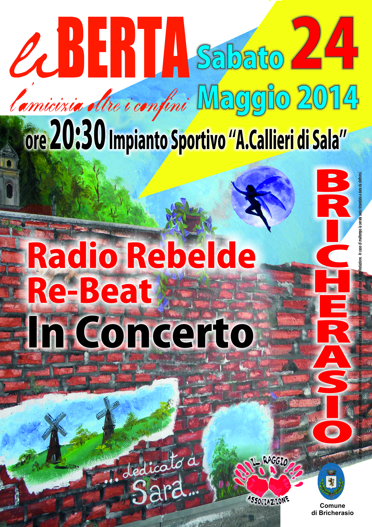 Sabato 24 maggio alle ore 20,30 agli impianti sportivi “Guido Calleri di Sala” di Bricherasio si ripete il concerto in memoria di Sara, la giovane bricherasiese prematuramente scomparsa due anni fa e gli amici riorganizzano una serata di musica chiamata “liBERTA, l’amicizia oltre il confine”. L’evento è organizzato dai conoscenti di Sara che si sono avvalsi della collaborazione del Comune di Bricherasio e dell’Associazione “Il Raggio” vede come protagonisti i Radio Rebelde e i Re-beat. Radio Rebelde nasce originariamente nel 1988 a Venezia. Nel 1991 esce in autoproduzione il primo demotape di 6 pezzi, "Culturegghe". Nel 1993 viene pubblicato il brano "Esternazione" e nel 1996 il primo vero album della band, "Tam tam". Ultimo lavoro in ordine di tempo è stata la pubblicazione di un CD single autoprodotto distribuito con un fumetto, un progetto che sta cuore a Radio Rebelde, viste le letture preferite dei membri del gruppo. Dopo una pausa decennale, la voglia di riprendere le trasmissioni ha vinto ogni timore e dubbio, e la band ha ripreso il suo cammino “come niente fosse”, forte anche delle passate esperienze musicali e non accumulate dai membri, continuando di nuovo l'esplorazione del suono reggae del ventunesimo secolo. I Re-beat sono un gruppo di musicisti torinesi che hanno deciso di riproporre escusivemante dal vivo i grandi successi degli anni '60. Il loro è un repertorio tutto da ballare con tanto di cambi d'abito e parrucche con Ilaria Allegri, che nel 2008 è in tour come corista con Eugenio Finardi in "Un Uomo" tour. Attualmente studia canto lirico e pianoforte con il bricherasiese Paolo Gambino ed è stata la corista nel programma per bambini su raitre, Trebisonda. Buona musica, servizio bar e ristoro!!!