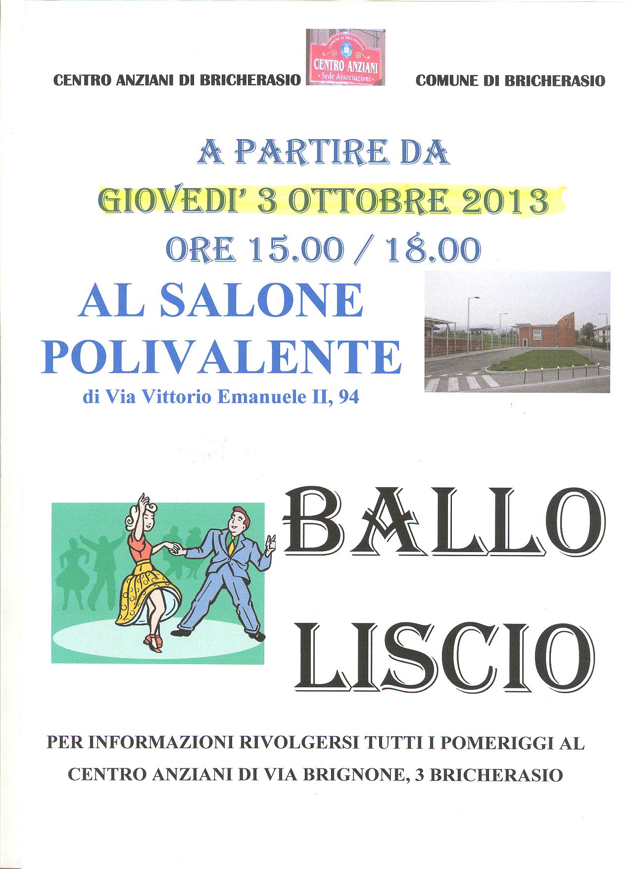 Il Centro Anziani di Bricherasio in collaborazione con il Comune offre la possibilità di ballare il liscio al salone polivalente di Via Vittorio Emanuele II, 94 il giovedì a partire dalle 15,00 con inizio il 3 ottobre. Per informazioni rivolgersi, tutti i pomeriggi, dalle ore 15.00 alle 18.00, presso il Centro Anziani di Via Brignone, 3 a Bricherasio.
