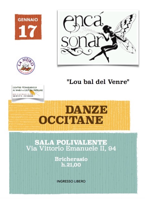 Il Centro Pedagogico di Cultura e Danza popolare, di frazione Cappella Merli a Bricherasio propone per venerdì 17 gennaio alle ore 21 al Salone Polivalente di Piazza Don Morero a Bricherasio “Lou bal del Venre”, una serata di danze occitane con il gruppo “Encà Sonar”. Dopo 4 anni, dal 2004 al 2008, di esperienza con i Lou Bram, Ivan Cavallo (Violino e Viola) Alberto Filimenti (Ocarina, Flauto e Voce), Matteo Griffone (Fisarmonica e Voce) decidono di ritornare alle origini formando il gruppo Encà Sonar. Informazioni e prenotazione al 349/1815715 o scrivere a mariabaffert@yahoo.it