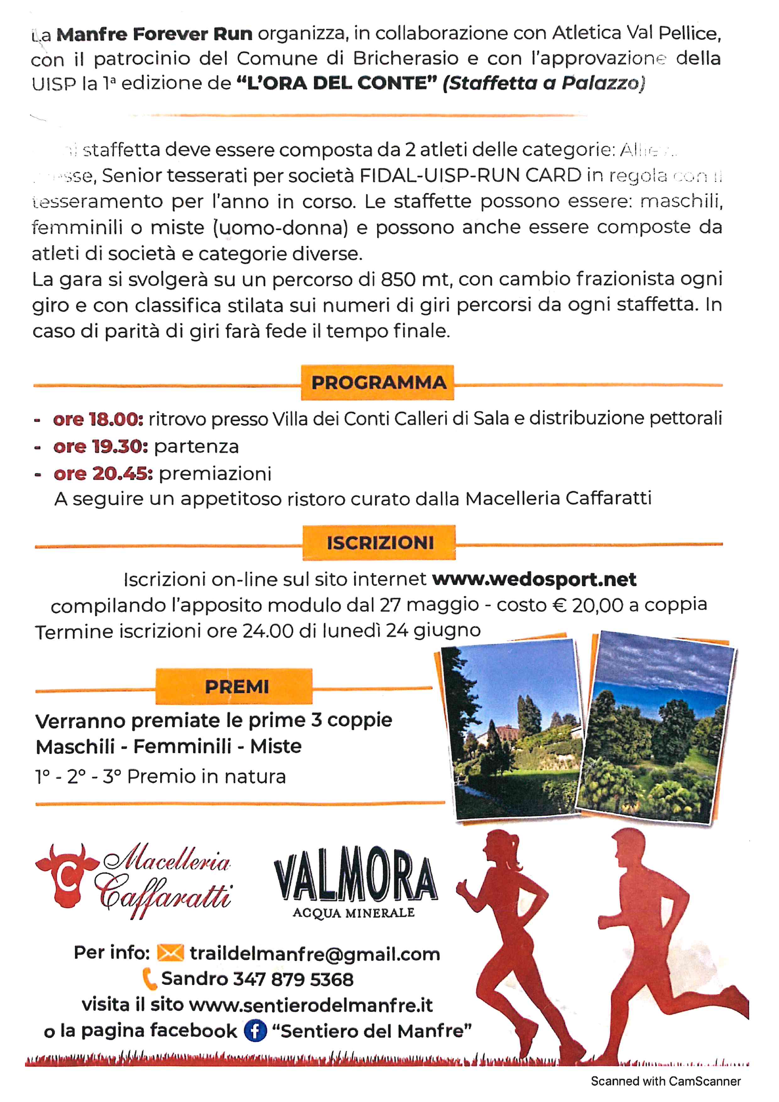Sono aperte le iscrizioni on line sul sito internet www.wedosport.net per partecipare alla 1^ edizione dell’Ora del Conte, gara podistica competitiva a staffetta della durata di un’ora organizzata dall’Associazione “Sentiero del Manfre” prevista giovedì 27 giugno presso il parco del Palazzo Cacherano dei Conti di Bricherasio. La magnifica location costituita da laghetti e parco sarà invasa da podisti che gareggiano in un vero e proprio polmone verde all’interno del paese, un parco di quasi cinque ettari che i proprietari conservano con cura. L’amicizia tra Guido ed il Presidente dell’Associaziione “Sentiero del Manfre”, Sandro Caffaratti, ha creato la staffetta a Palazzo che si spera diventi un appuntamento fisso nel panorama podistico. Drin guida una allegra combriccola che vuole sempre ricordare Claudio Manfredi, giovane podista bricherasiese deceduto qualche anno fa, ad iniziare dalla corsa denominata “Trail del Manfre” disputata nella frazione di San Michele a marzo e Domenica 2 giugno si sono recati in Trentino due dozzine di associati per partecipare alla salutare avventura nella natura “La Corsa nelle Dolomiti” tra Cortina e Dobbiaco, storica gara podistica in montagna di 30 km. Per la gara di giovedì 27 ogni staffetta deve essere composta da due atleti/e o mista anche di società e categorie diverse a partire dagli Allievi su di un circuito di 850 metri con cambio frazionista ad ogni giro e classifica finale stilata sul numero di giri percorsi. Il programma prevede il ritrovo alle 18 presso Villa Calleri, in Via Vittorio Emanuele II n. 11 per la distribuzione dei pettorali, alle 19,30 la partenza e al termine le premiazioni alle quali segue un ricco ristoro fornito dalla Macelleria Caffaratti. Ci si deve iscrivere compilando il modulo reperibile al sito sopra indicato entro lunedì 24 giugno al costo di 20 € a coppia e verranno premiate le prime tre maschili, femminili e miste con doni in natura. Per ulteriori informazioni scrivere una mail a traildelmanfre@gmail.com oppure telefonare a Sandro al 3478795368. Si può visitare il sito www.sentierodelmanfre.it e la pagina facebook “Sentiero del Manfre”.