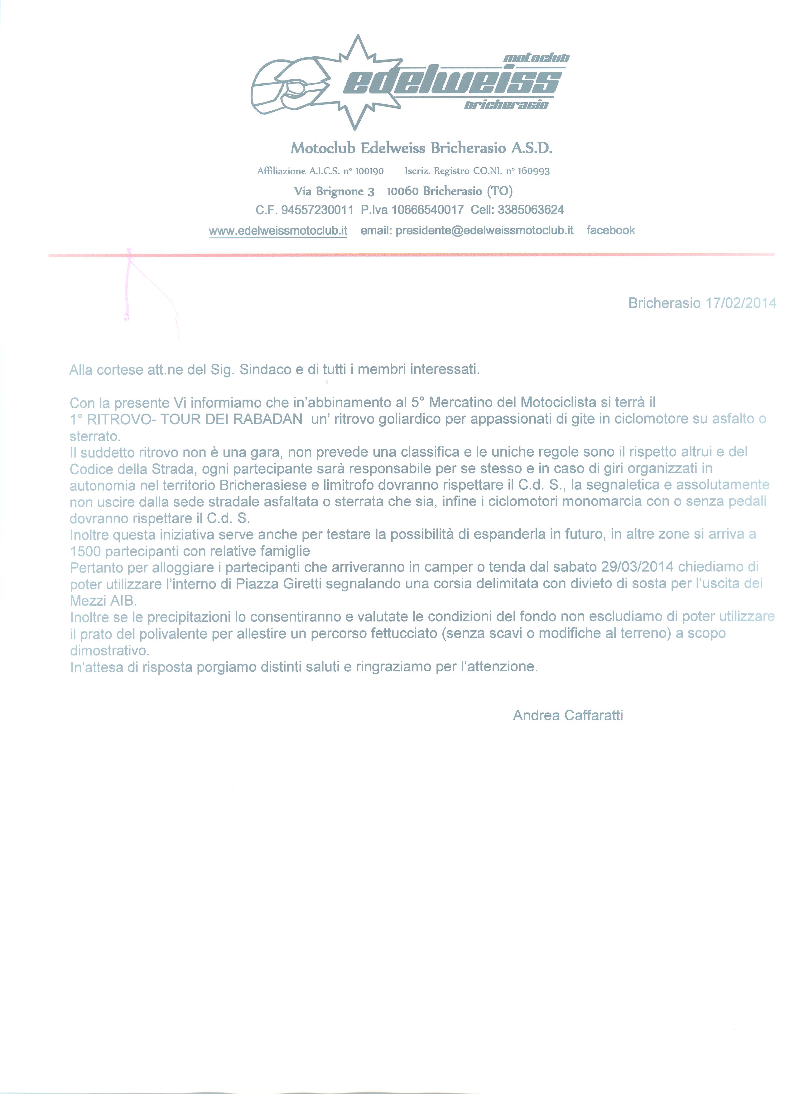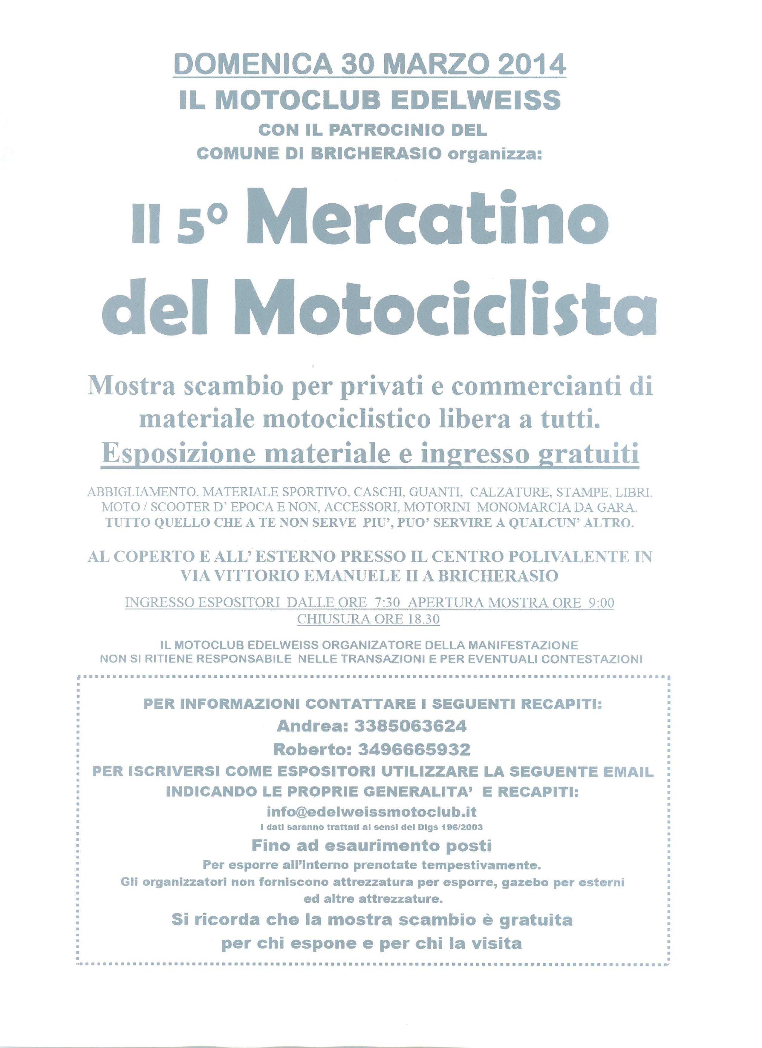 Il Motoclub Edelweiss di Bricherasio, con il patrocinio del Comune di Bricherasio, organizza per Domenica 30 marzo la quinta edizione de “Il mercatino del motociclista”, mostra scambio per privati e commercianti di materiale motociclistico con esposizione libera a tutti e gratuita. L’evento che quest'anno darà spazio e visibilità anche ai ciclomotori che vengono utilizzati nelle seguitissime maratone tipo la Monferraglia, si svolge al coperto ed all’esterno del Salone Polivalente di Via Vittorio Emanuele II, a Bricherasio dove ogni appassionato potrà esporre e scambiare il proprio surplus di materiale motociclistico come abbigliamento, accessori, manuali di officina, stampe e riviste del settore. L’esposizione dei prodotti, ad ingresso gratuito, comincia alle ore 9,00 e termina alle 18,30. Per aderire alla manifestazione si deve utilizzare fino ad esaurimento posti il sito internet all’indirizzo info@edelweissmotoclub.it indicando le proprie generalità e recapiti. Per informazioni contattare Andrea al 338/5063624 o Roberto al numero 349/6665932. Per esporre si consiglia di prenotare tempestivamente e si ricorda che gli organizzatori non forniscono attrezzature e gazebo.