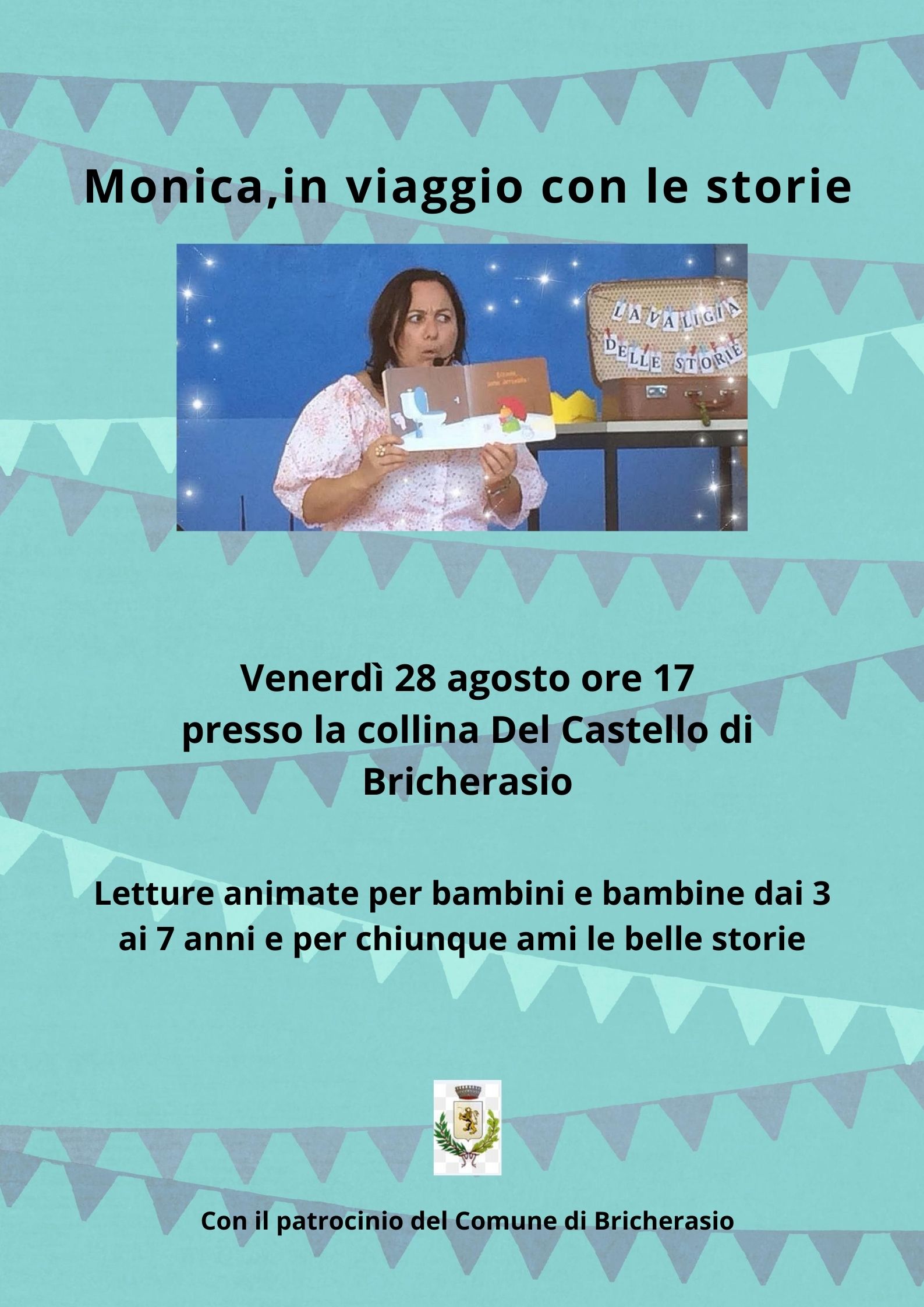 È tempo di incontrare tutti gli amanti delle belle storie per leggerle ed ascoltarle all'aperto, nella piacevole cornice della Collina del Castello. Venerdì 28 agosto, alle ore 17, Monica, con il patrocinio del Comune di Bricherasio, racconta letture animate per bambini e bambine dai 3 ai 7 anni e per chiunque ami i fantastici racconti. Siete pronti a partire per questo viaggio? Preparate il vostro vagone (una comoda coperta di casa). Monica vi aspetto sul binario delle storie. Accorrete bimbi e portate anche le mamme e i papà, i nonni, gli zii e gli amici.