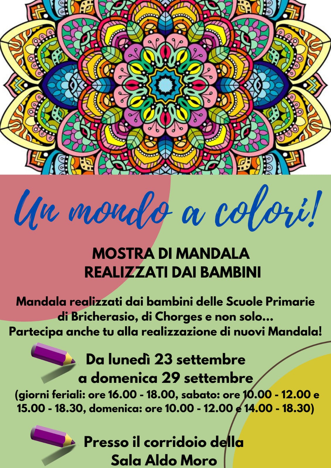 I bambini delle scuole primarie di Bricherasio e Chorges e non solo hanno predisposto la mostra di mandala "Un mondo a colori", allestita nel corridoio della Sala Aldo Moro (Via Vittorio Emanuele II, 79/B, presso la biblioteca) ed aperta da lunedì 23 a domenica 29 settembre, nei seguenti orari: