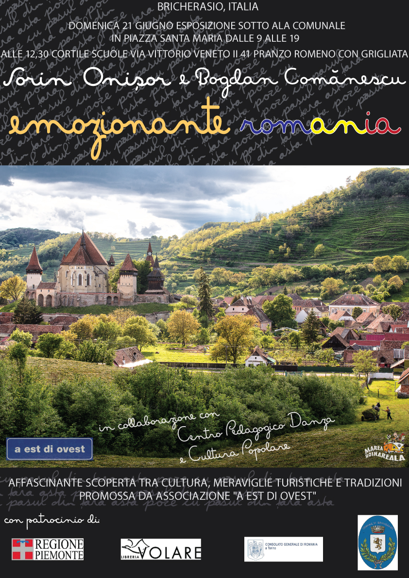 Promossa dall'Associazione a Est di Ovest, con il patrocinio del Comune di Bricherasio e la collaborazione del Centro Pedagogico di Danza e cultura Popolare, la mostra "Emozionante Romania" di domenica 21 giugno dalle ore 9 alle 19 sotto l’ala comunale si abbina ad un momento gastronomico, pranzo romeno con grigliata (antipasti, carne, dolce, bibite e caffè) proposta presso le Scuole di via Vittorio Emanuele II. Si tratta di un allestimento patrocinato anche dal Consolato della Romania di Torino e dalla Regione Piemonte. Un'iniziativa dal carattere itinerante con al centro attrazioni turistiche, tradizioni e cultura di uno stato europeo da cui proviene la comunità straniera più numerosa presente a Bricherasio. Adesioni al pranzo, costo 20 euro per raccolta fondi, preferibilmente entro sabato 19, alla mail aestdiovest@gmail.com. La mostra comprende un centinaio di splendide fotografie proposte in ingrandimento d’impatto, realizzate nell’ultimo anno da Sorin Onisor e dalla sua squadra di viaggiatori-esploratori, durante i workshop fotografici rumeni. Scatti che rappresentano con tocco magico di questo affermato fotografo, uno slancio verso la conoscenza diretta dei tanti luoghi e contesti affascinanti per il viaggiatore italiano, per il turista occasionale come per chi da quelle zone proviene e con orgoglio d’appartenenza non stucchevole ha la possibilità di rivendicare l’attrattività della sua terra. A Torino, nell’area metropolitana ed in tutto il Piemonte, la comunità romena è la più numerosa. Il cuore del capoluogo e successivamente un punto di riferimento dello shopping sono cornice azzeccata per la mostra sul Paese dei Carpazi. Il percorso fotografico, nato dal desiderio di documentare un aspetto triste della Romania contemporanea, si pone appunto anche lo scopo di sottolineare in modo allarmante la sparizione di luoghi tradizionali e il bisogno di questo Stato europeo di conservare paesaggi, conoscenze, mestieri, sapori e usanze trasmesse di padre in figlio.