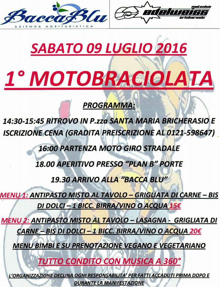 Il Motoclub Edelweiss e l’Agriturismo “Bacca Blu” di Bricherasio, organizzano per sabato 9 luglio la prima edizione della Motobraciolata. Dalle ore 14,30 alle 16 raduno dei partecipanti in Piazza Santa Maria per l’iscrizione alla cena, gradita la prenotazione allo 0121/598647, prima della partenza per il moto giro stradale. Alle 18 l’aperitivo al “Plan B” di Porte. L’arrivo alla “Bacca Blu” in Strada Rivà 31 a Bricherasio per la cena alle ore 19,30. Previsti due menù, il primo composto da antipasto misto al tavolo, grigliata di carne, bis di dolci ed un bicchiere di birra o vino a 15 €. Il secondo menù comprende anche le lasagne e costa 20 €. Inoltre menù per i bambini e su prenotazione si può mangiare vegano e vegetariano. Il tutto condito da musica a 360 gradi.