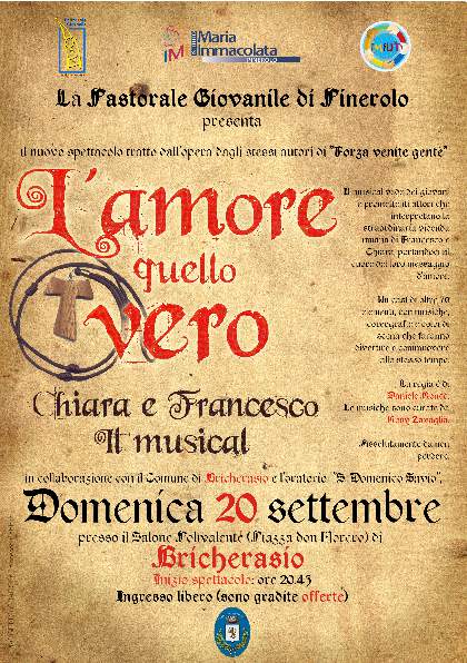 In apertura di questo nuovo Anno Pastorale, l’Ufficio di Pastorale Giovanile di Pinerolo è felice ed orgoglioso di presentare a Bricherasio domenica 20 settembre alle ore 20,45 presso il Salone Polivalente di Piazza Don Morero, all’interno della 47^ Sagra dell’Uva, il nuovo spettacolo "L’amore quello vero. Francesco e Chiara d’Assisi". Il musical, tratto dall’opera degli stessi autori di “Forza, venite gente!” è messo in scena da giovani e promettenti attori che interpretano la straordinaria vicenda umana di Francesco e Chiara. Portandoci al cuore del loro messaggio d’amore, questo cast di oltre 70 elementi, alcuni bricherasiesi, farà divertire e commuovere allo stesso tempo, coadiuvato da un attento lavoro di musiche, coreografie e colpi di scena. La regia è di Daniele Ronco. Le musiche sono curate da Rosy Zavaglia, con il coro della PiGì, la “Pastorale Giovanile” che è la proposta educativa che la Comunità Ecclesiale, sotto la guida del Vescovo, fa nei confronti dei propri giovani, perché possano crescere come persone, mature ed equilibrate e, diventando adulti nella fede, rispondere alla propria vocazione nella Chiesa e nel mondo.