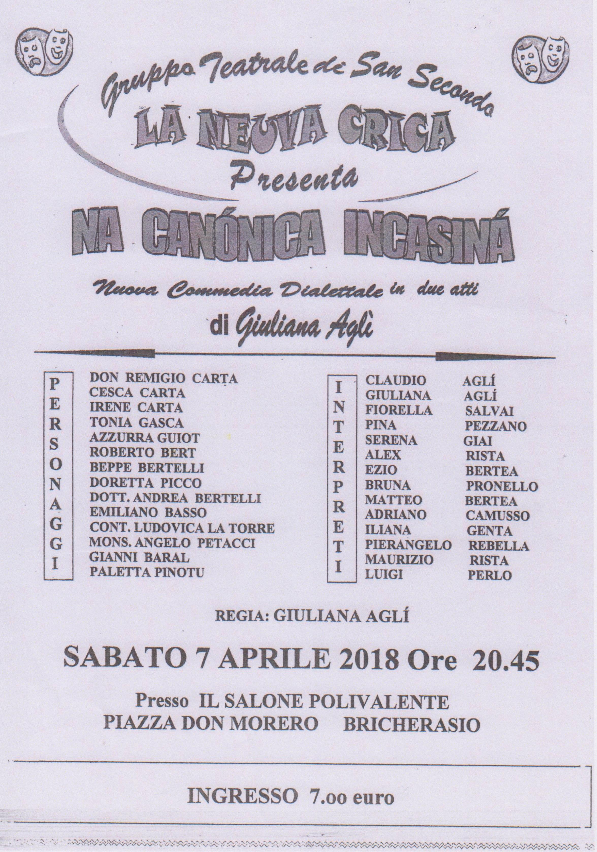 Sabato 7 aprile alle ore 20,45 nel Salone Polivalente di Piazza Don Morero a Bricherasio rappresentazione della commedia dialettale piemontese in due atti della Neuva Crica, Gruppo Teatrale di San Secondo, dal titolo "Na canonica incasinà" con la regia di Giuliana Aglì. Ingresso 7 €.
