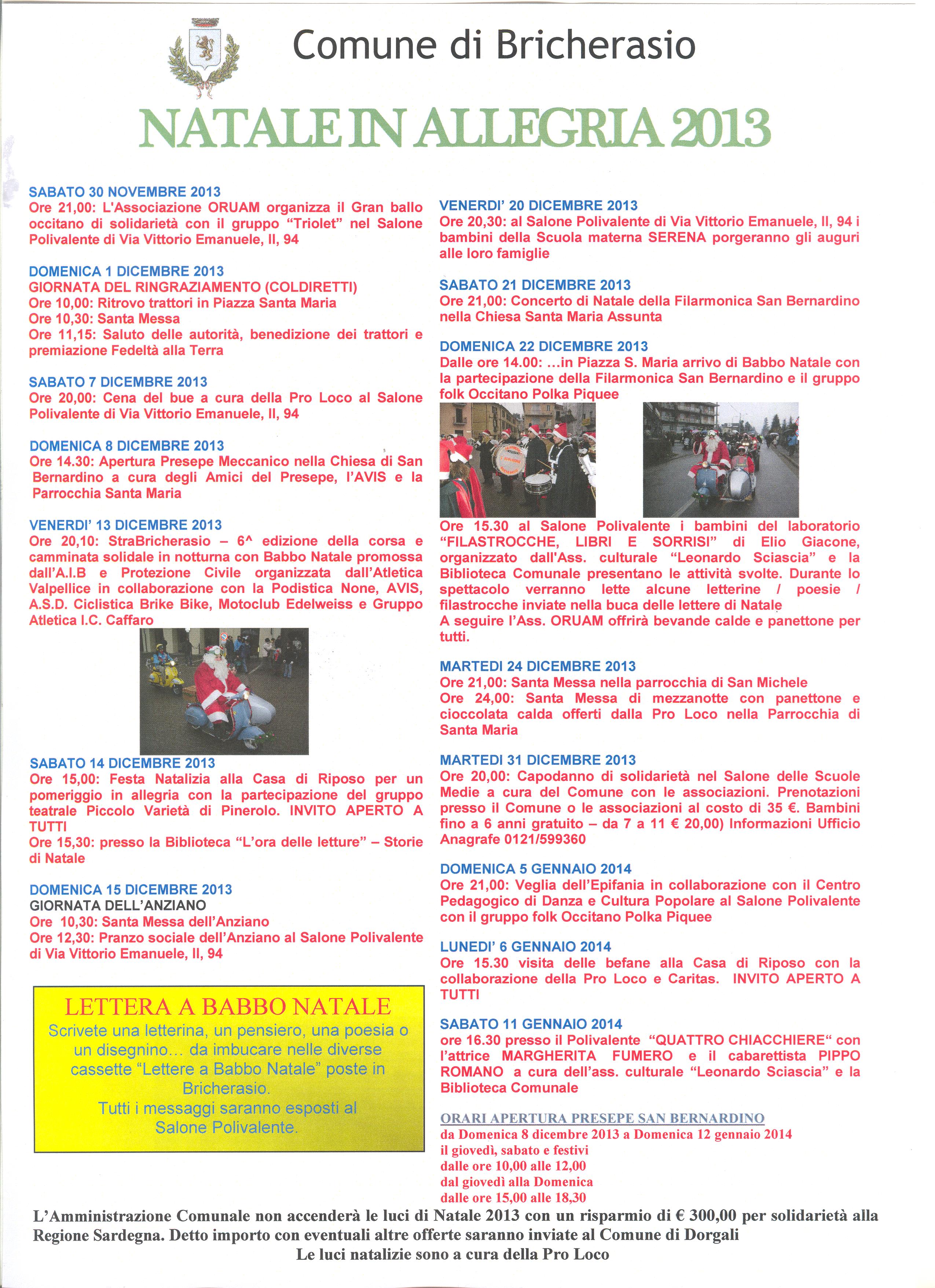 Venerdì 13 torna per la sesta edizione la StraBricherasio, corsa e camminata solidale in notturna con Babbo Natale promossa dall’A.I.B e Protezione Civile organizzata dall’Atletica Valpellice in collaborazione con la Podistica None, AVIS, A.S.D. Ciclistica Brike Bike, Motoclub Edelweiss e Gruppo Atletica I.C. Caffaro. Sabato 14 dalle 15,00 Festa Natalizia alla Casa di Riposo per un pomeriggio in allegria con la partecipazione del gruppo teatrale Piccolo Varietà di Pinerolo. Il Comitato Anziani di Bricherasio organizza la giornata dell’Anziano per Domenica 15 dicembre con la Santa Messa e il pranzo sociale. Venerdì 20 alle 20,30 al Salone Polivalente spettacolo natalizio a cura della Scuola materna Serena per porgere gli auguri natalizi alle loro famiglie. La sera di sabato 21 immancabile concerto di Natale della Filarmonica San Bernardino nella Chiesa Santa Maria Assunta. La Domenica dalle ore 14.00 in Piazza S. Maria arrivo di Babbo Natale con la partecipazione della Filarmonica San Bernardino e il gruppo folk Occitano Polka Piquee. Alle ore 15.30 al Salone Polivalente i bambini del laboratorio “Filastrocche, libri e sorrisi” di Elio Giacone, organizzato dall'Associazione culturale “Leonardo Sciascia” e la Biblioteca Comunale presentano le attività svolte. Durante lo spettacolo verranno lette alcune letterine / poesie / filastrocche inviate nella buca delle lettere di Natale e a seguire l’Associazione ORUAM offrirà bevande calde e panettone per tutti. La vigilia di Natale le Messe nella parrocchia di San Michele alle 21,00 e a mezzanotte la Santa Messa con panettone e cioccolata calda offerti dalla Pro Loco nella Parrocchia di Santa Maria. San Silvestro si festeggia l’ultimo giorno dell’anno nel Salone delle scuole medie con il Capodanno di solidarietà a cura del Comune con le associazioni. Domenica 5 gennaio alle ore 21,00 Veglia dell’Epifania in collaborazione con il Centro Pedagogico di Danza e Cultura Popolare al Salone Polivalente