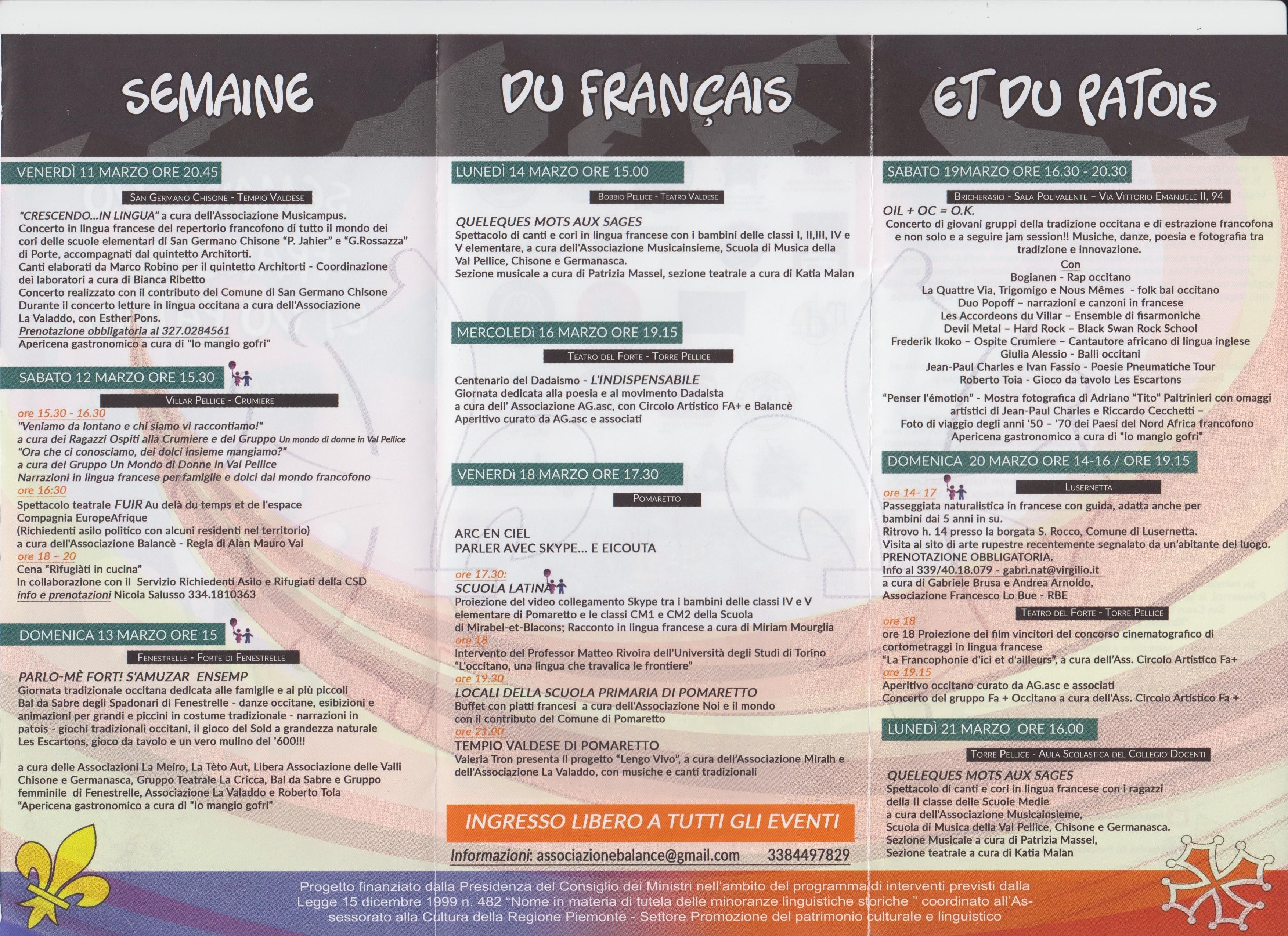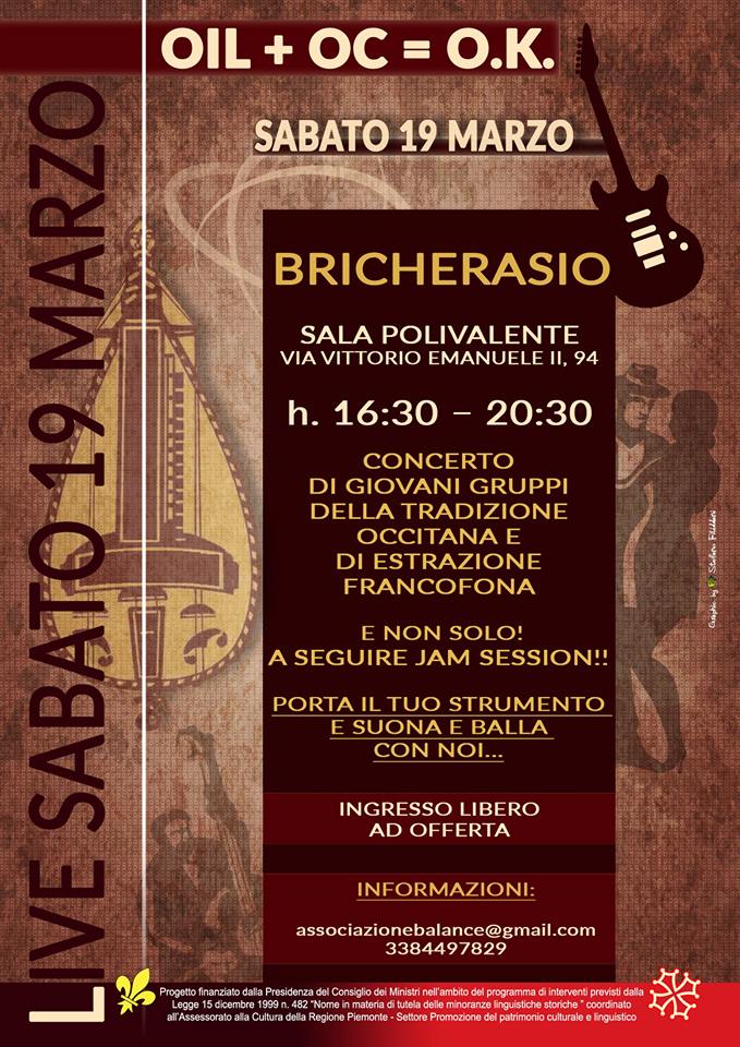 L'Unione Montana del Pinerolese, l'Unione Montana dei Comuni Valli Chisone e Germanasca e l'Associazione Culturale Balancè, con il patrocinio della Regione Piemonte, presentano sabato 19 marzo, dalle ore 16.30 alle 20.30, a Bricherasio presso la Sala Polivalente in Piazza Don Morero, "Oil + Oc = O.K.", concerto di giovani gruppi della tradizione occitana e di estrazione francofona e non solo e a seguire jam session all'interno della "Semaine du français et du patois". Si può portare il proprio strumento e suonare con altri partecipanti. Sulle note delle musiche popolari occitane e francesi, e non solo, generi diversi, musicalità differenti trovano un terreno comune su cui dialogare. Musiche, danze, poesia e fotografia tra tradizione e innovazione. Sono presenti Bogianen e il suo rap occitano, La Quattre Via, Trigomigo, Nous Mêmes con il loro folk bal occitano, Duo Popoff che narra e canta in francese, Les Accordeons du Villar per un insieme di filarmoniche. poi l'hard rock di Devil Metal, il cantautore africano Frederik Ikoko, Giulia Alessio con i balli occitani, Jean-Paul Charles e Ivan Fassio e le poesie pneumatiche e Roberto Toia con i giochi da tavola. Inoltre la mostra fotografica di Adriano “Tito” Paltrinieri con omaggi artistici di Jean Paul Charles e Riccardo Cecchetti con foto di viaggio dagli anni '50 ai '70 dei paesi del Nord Africa francofono. Al termine apericena gastronomico a cura di "Io mangio gofri".
