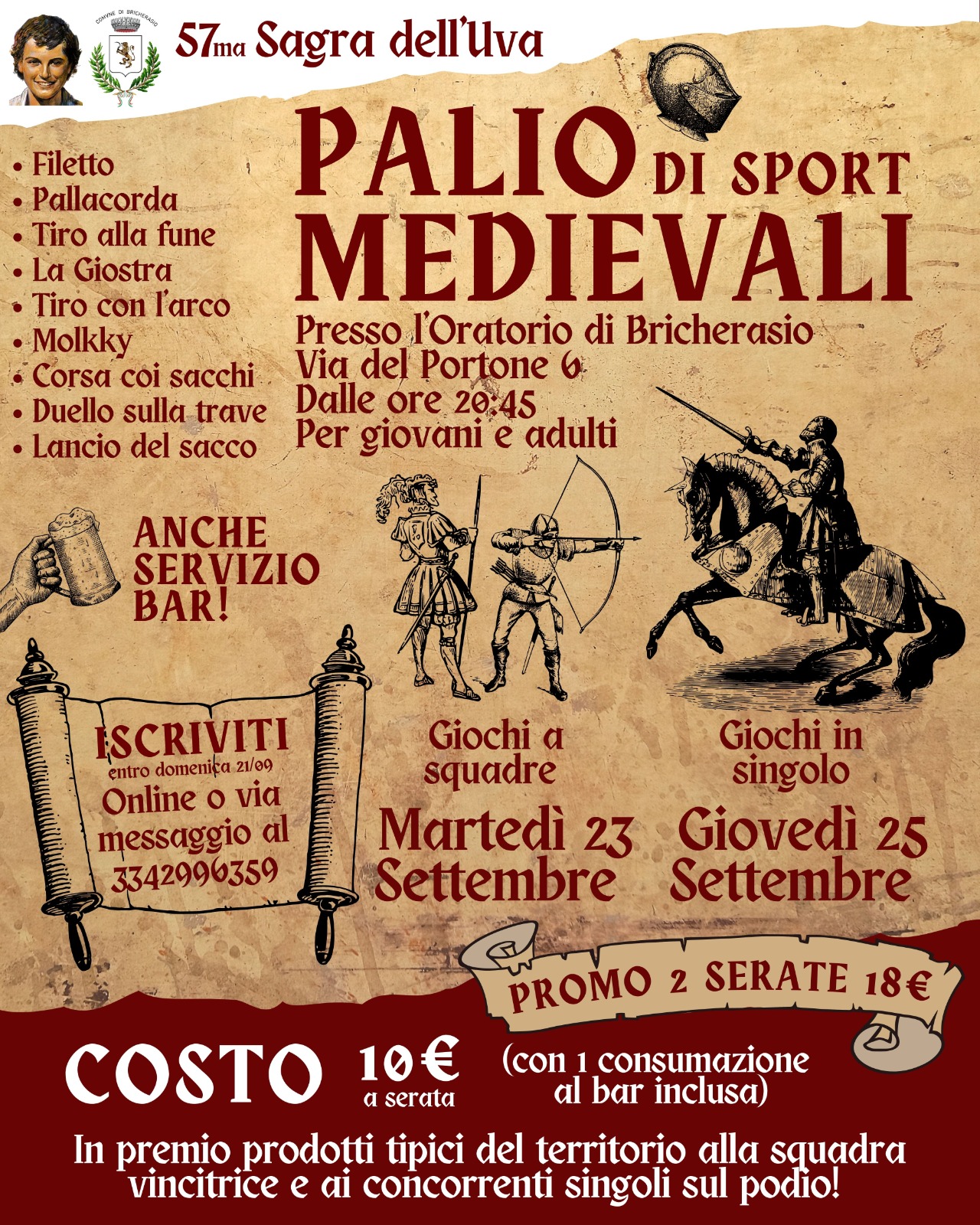 Il gruppo giovani dell'oratorio di Bricherasio presenta un PALIO di SPORT MEDIEVALI 🏹 per martedì 23 e giovedì 25 settembre dalle ore 20,45 in Oratorio, pensato per i giovani e gli adulti, con la possibilità di scegliere tra la serata a squadre da 3 o la serata di giochi individuali, oppure di farle entrambe! ⚾🏏🏹