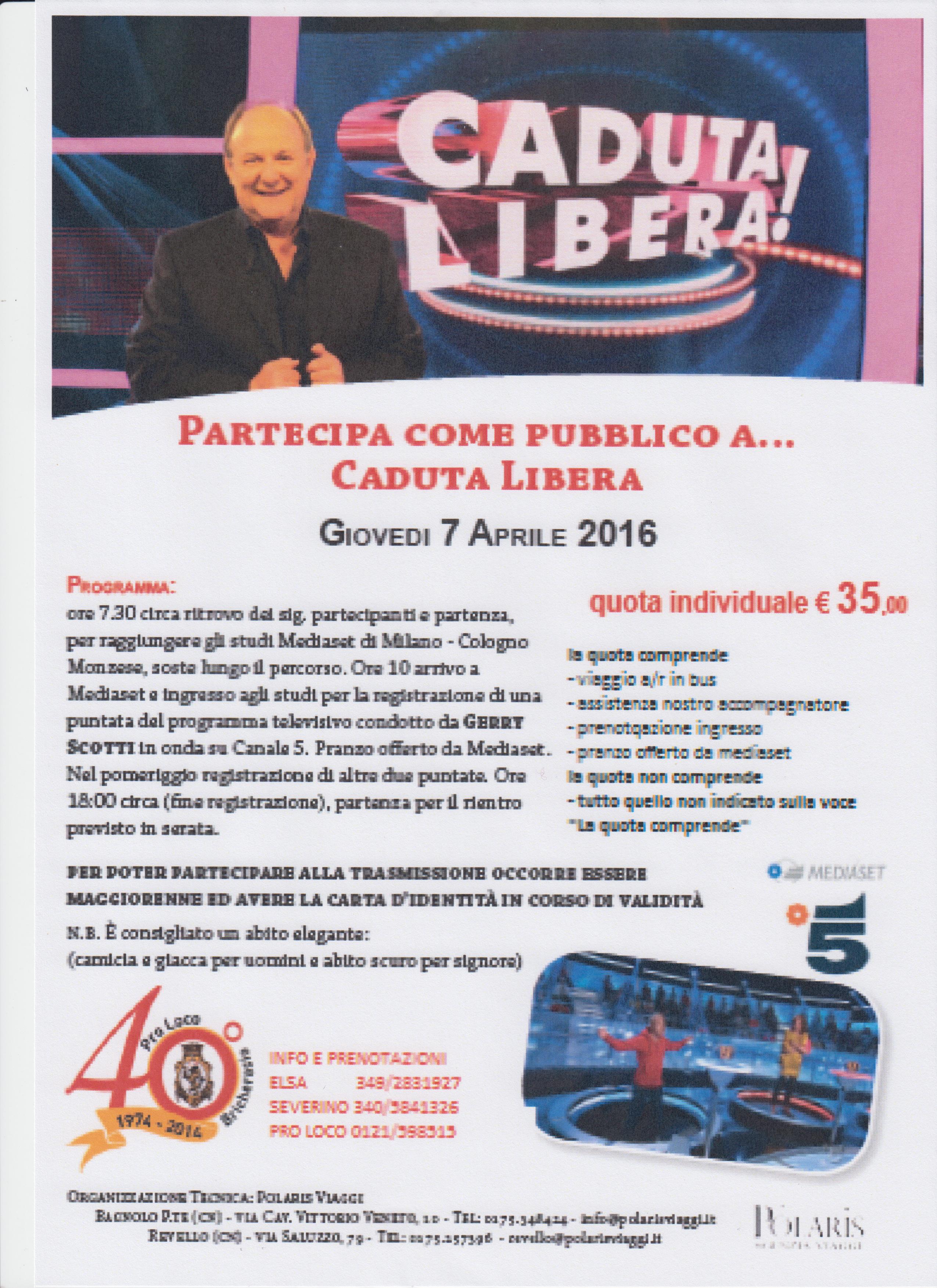 Si deve telefonare ai numeri 0121/598515, 349/2831927 oppure 340/5841326, per informazioni e per partecipare come pubblico a "Caduta Libera", il seguito programma tv di Gerry Scotti. La Pro Loco di Bricherasio propone infatti per giovedì 7 aprile una gita per raggiungere gli studi Mediaset di Cologno Monzese. Partenza alle ore 7,30 per la Lombardia. Arrivo previsto alle ore 10,00 per l’ingresso agli studi e la registrazione di una puntata della trasmissione. Dopo il pranzo offerto da Mediaset nel pomeriggio si registreranno altre due puntate. Verso le ore 18,00 partenza per il rientro a Bricherasio. Per poter partecipare è necessario essere maggiorenni ed è consigliato indossare abito scuro elegante per le signore e camicia e giacca per gli uomini. La quota individuale di partecipazione è di 35,00 € e comprende il viaggio in autobus, l’assistenza con accompagnatore e la prenotazione dell’ingresso.