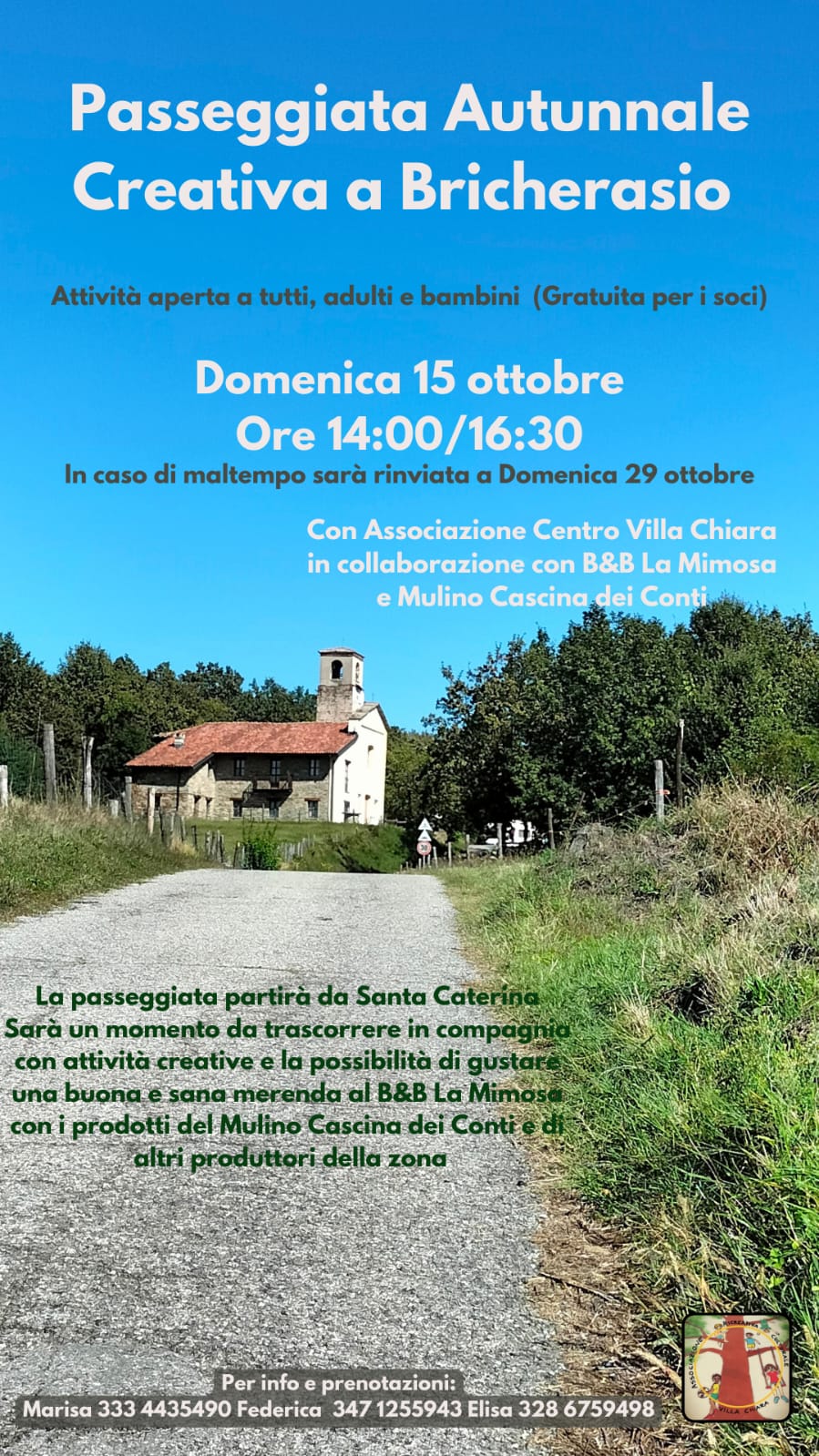 L’Associazione Villa Chiara, centro per incontri, attività varie e laboratori, di Via Daneo n. 8 a Bricherasio, propone in collaborazione con il bad & breakfast La Mimosa ed il Mulino Cascina dei Conti, per Domenica 15 ottobre dalle ore 14.00 alle 16.30 una passeggiata autunnale creativa nel paese. L’attività è aperta a tutti. La camminata parte da Santa Caterina per vivere un momento da trascorrere in compagnia di attività creative e la possibilità di gustare una sana merenda al b&b La Mimosa con i prodotti del sopracitato Mulino e di altri produttori della zona. Per informazioni e prenotazioni chiamare Marisa al 333/4435490, Federica al 347/1255943 oppure Elisa al 328/6759498.