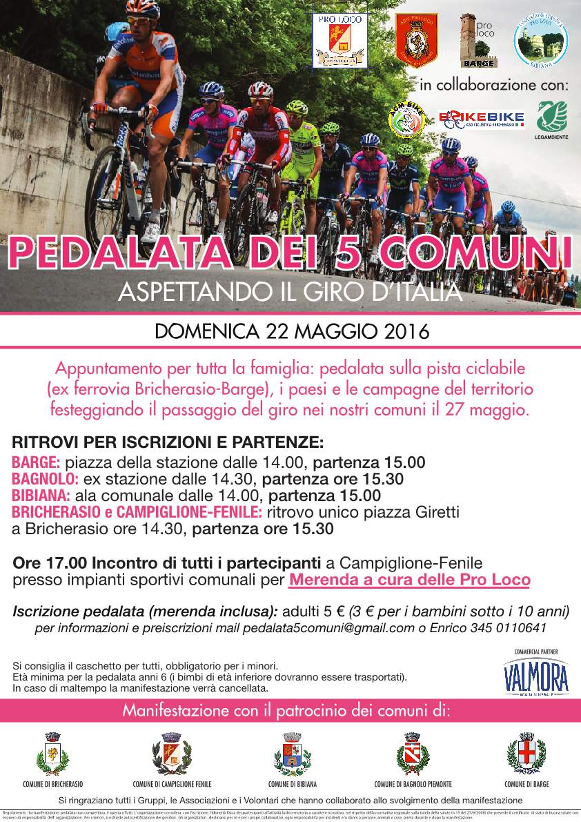 Per festeggiare il passaggio del 99° Giro ciclistico d'Italia a fine mese nel territorio pinerolese, le Pro Loco di Bibiana, Bricherasio, Campiglione Fenile e Barge, le Amministrazioni Comunali di Bibiana, Bricherasio, Campiglione Fenile, Bagnolo e Barge e le associazioni Legambiente, circoli di Barge e Valpellice, BrikeBike e ACM Bike hanno unito le forze e propongono per domenica 22 maggio una grande pedalata dei 5 comuni. Si tratta di un appuntamento a misura di famiglia, pedalando dolcemente fra i paesi e la pista ciclabile dell'ex-ferrovia Bricherasio-Barge con partenze dai vari comuni: alle ore 15 da Barge, piazza della Stazione, e da Bibiana, ala comunale, ore 15.30 da Bagnolo, ex-stazione, e da Bricherasio, in piazza Giretti e un grande incontro di tutti i partecipanti sul territorio di Campiglione con merenda al sacco a cura delle Pro Loco intorno alle ore 17.00 presso gli impianti sportivi. Ritorno libero lungo la pista ciclabile. Ritrovo e iscrizioni sul posto da un'ora prima della partenza. La quota di adesione è di 5 €, ridotta a 3 € per i ragazzi sotto i 10 anni. Informazioni e preiscrizioni via mail all’indirizzo pedalata5comuni@gmail.com o telefonicamente al numero 345-0110641. Si consiglia l’uso del casco per tutti (obbligatorio per i minori); età minima per la pedalata 6 anni, i bimbi di età inferiore dovranno essere trasportati. In caso di maltempo la manifestazione verrà annullata.