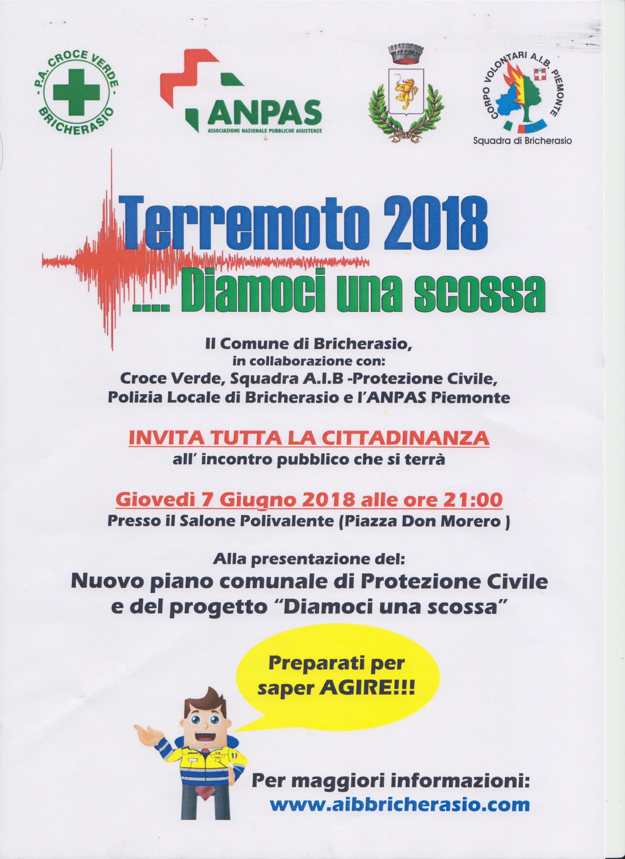 L'Amministrazione Comunale di Bricherasio, in collaborazione con ANPAS Regione Piemonte, la Squadra AIB - Protezione Civile Bricherasio, la Croce Verde di Bricherasio, la Polizia Locale e tecnici del settore, invita tutta la cittadinanza a partecipare all'incontro, che si terrà Giovedì 7 Giugno alle ore 21 presso il salone polivalente di Piazza Don Morero a Bricherasio, per la presentazione del nuovo "Piano di Protezione Civile Comunale" ed il progetto "Diamoci una Scossa" che vedrà coinvolti alcuni studenti delle scuole elementari di Bricherasio. Per ulteriori informazioni consultare il sito: www.aibbricharasio.com