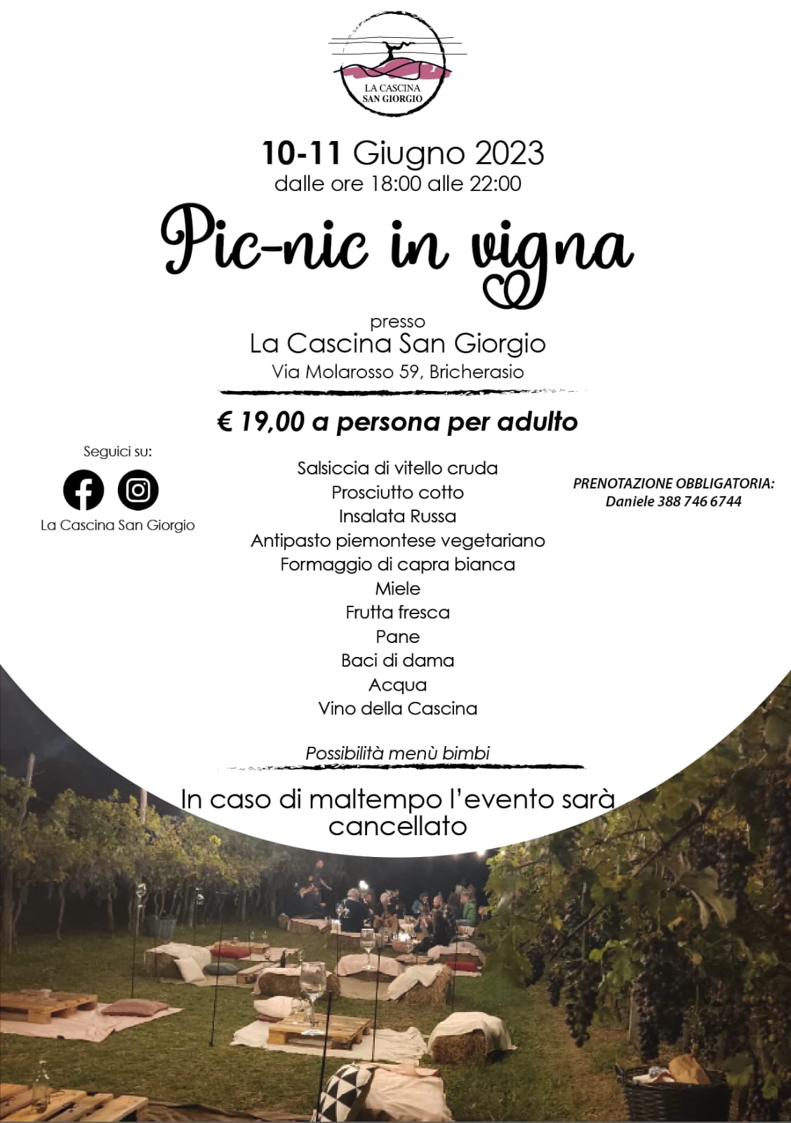 La Cascina San Giorgio in Via Molarosso 59 a Bricherasio dopo il successo dell’anno scorso ripropone per sabato 10 e Domenica 11 giugno i Pic.nic in vigna dalle ore 18 alle 22. Le sere del weekend si può cenare tra i filari sotto le stelle con un menù di prodotti locali a 19 € e la possibilità di avere un menù per i bambini. In caso di maltempo l’evento sarà cancellato. Per prenotazione obbligatoria telefonare a Daniele al numero 388/7466744.