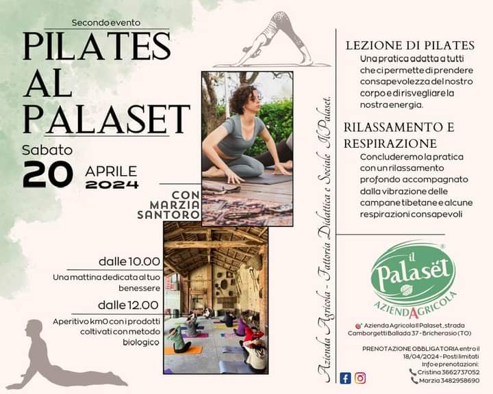 Continuano le attività sotto il Cas del Palaset, l’Azienda Agricola e Fattoria didattica di Strada Camborgetti Ballada, 37 a Bricherasio che per sabato 20 aprile organizza il secondo incontro con il Pilates a cura di Marzia Santoro, laureata in scienze motorie e insegnante certificata che accompagnerà in una mattinata di salute e buon cibo. Il programma della mattinata inizia alle ore 10 con l’attività motoria che permette ai partecipanti di prendere consapevolezza del proprio corpo e di risvegliare l’energia e e prosegue con un rilassamento profondo accompagnato dalla vibrazione delle campane tibetane con una respirazione consapevole. Dalle ore 12 aperitivo a km 0 con i prodotti coltivati con metodo biologico. I posti sono limitati con prenotazione obbligatoria e per informazioni e prenotazioni entro giovedì 18 rivolgersi a Cristina al 3662737052 oppure a Marzia al numero 3482958690.