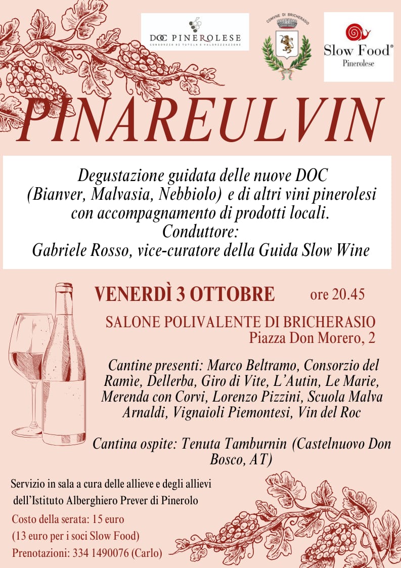 Ultima appendice della straordinaria Sagra dell’Uva di Bricherasio, giunta alla 57^ edizione è Pinareulvin, uno degli eventi cruciali del Settembre Bricherasiese, proprio in virtù del legame che sussiste tra la manifestazione e il prodotto vitivinicolo, con la partecipazione di svariate cantine. La degustazione guidata delle nuove DOC pinerolesi, arrivata a quota dodici presenze e sempre a cura di Slow Food Pinerolese, è prevista venerdì 3 ottobre alle ore 20,45 al Salone Polivalente di Piazza Don Morero, 2 a Bricherasio. Le cantine presenti sono Vignaioli Piemontesi, Merenda con CorvI, Lorenzo Pizzini, Giro di Vite, Marco Beltramo, Consorzio del Ramie, Le Marie, L’Autin, Dellerba, Scuola Malva Arnaldi e Vin del Roc con ospite la cantina astigiana Tenuta Tamburnin di Castelnuovo Don Bosco. Come nelle passate edizioni, la serata si svolge con accompagnamento di prodotti locali forniti dalla Macelleria Caffaratti di Bricherasio.
