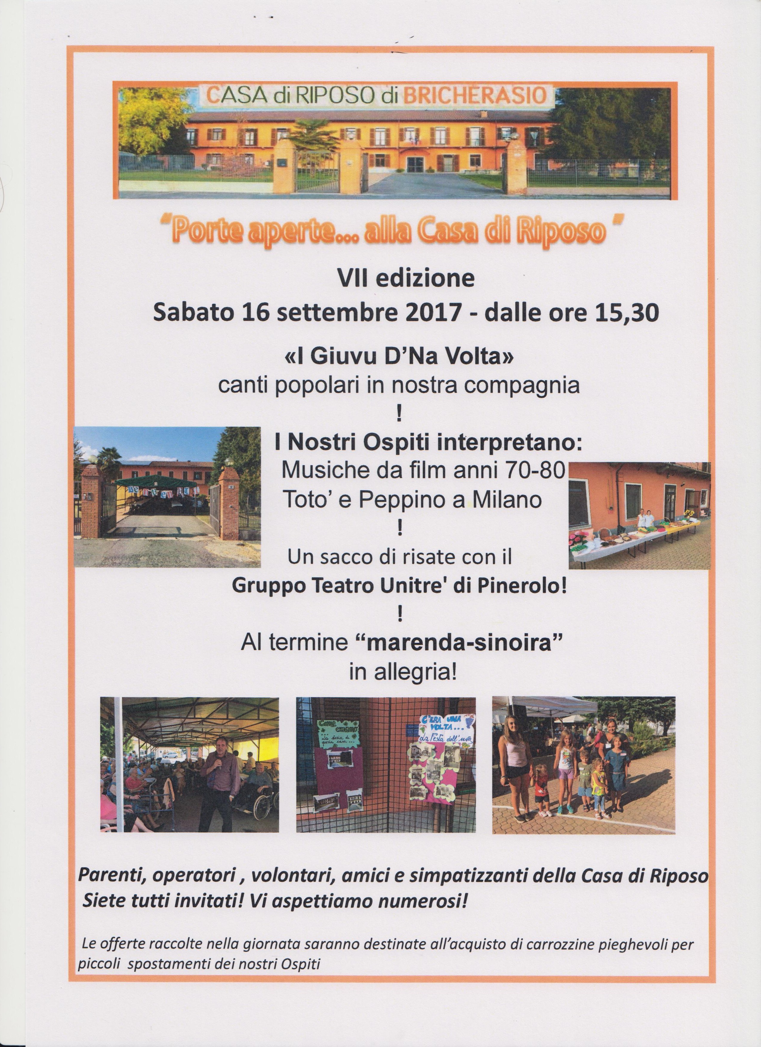 La Casa di Riposo di Bricherasio organizza nell’ambito della 49^ Sagra dell’Uva bricherasiese il classico appuntamento con le “Porte aperte alla Casa di Riposo” previsto per sabato 16 settembre. Il programma della settima edizione prevede a partire dalle ore 15,30 l’accoglienza e l’inizio delle attività di intrattenimento con “I giuvu d'na volta” (canti popolari in compagnia), cui seguirà un momento in cui gli ospiti della struttura interpretano musiche da film anni '70 e '80. Immancabili gli sketch comici e un sacco di risate con il Gruppo Teatro dell’Unitre di Pinerolo. Al termine la merenda sinoira. Sono invitati a partecipare operatori, volontari, parenti, amici, simpatizzanti e tutti coloro che vogliono trascorrere un pomeriggio con gli ospiti della Casa bricherasiese. Eventuali offerte saranno destinate all’acquisto di carrozine pieghevoli per lo spostamento degli stessi ospiti della Casa di Riposo.