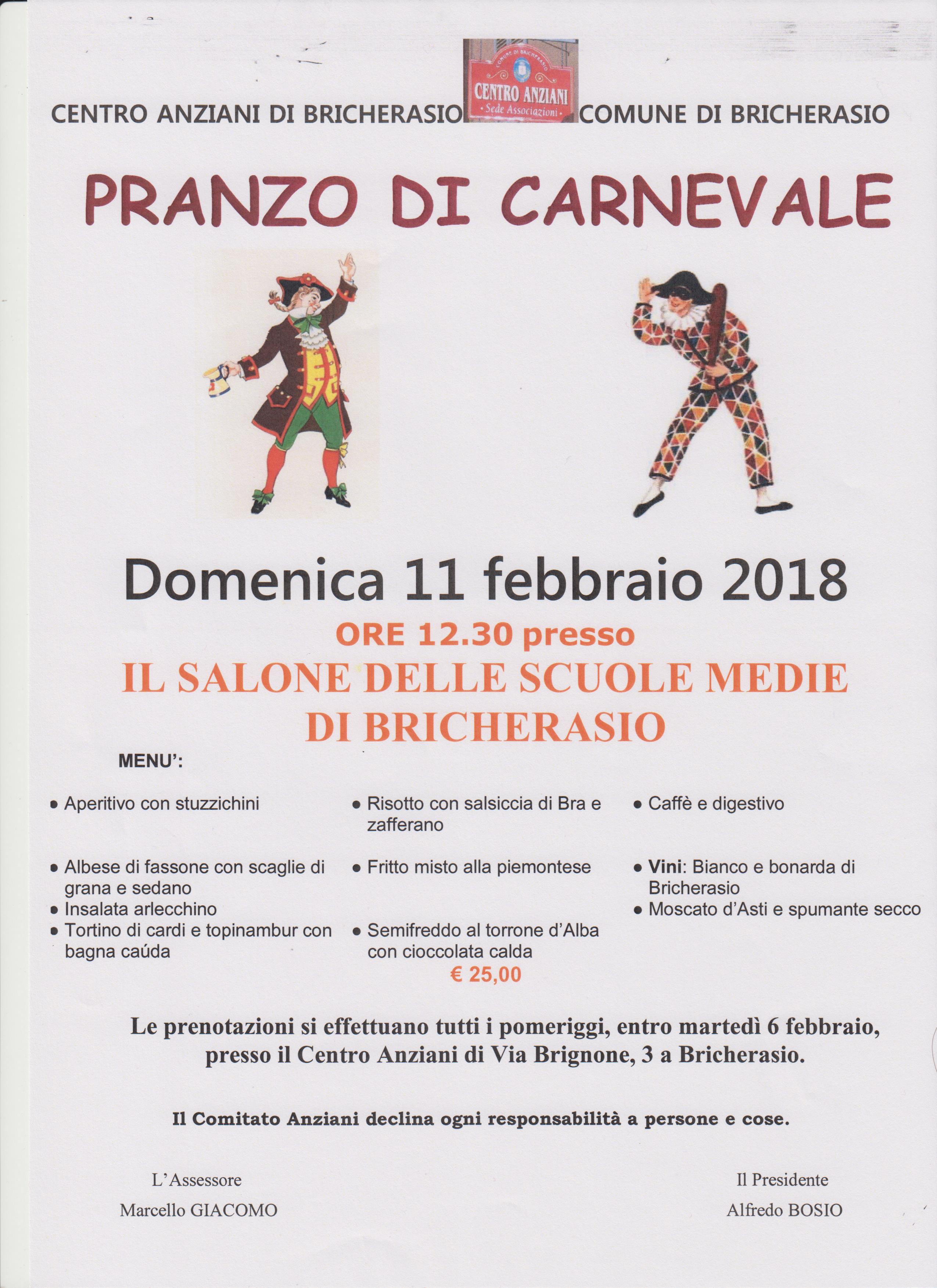 Il Centro Anziani di Bricherasio in collaborazione con il Comune organizza per Domenica 11 febbraio alle ore 12,30 l'immancabile pranzo di Carnevale presso Il Salone delle Scuole Medie di Bricherasio. Previsto un ricco menù composto, dopo l’aperitivo con stuzzichini, da Albese di fassone con scaglie di grana e sedano, Insalata arlecchino e Tortino di cardi e topinambur con bagna cauda come antipasti, Risotto con salsiccia di Bra e zafferano, Fritto misto alla piemontese, Semifreddo al torrone d’Alba con cioccolata calda, Caffè e digestivo il tutto annaffiato da vino Bianco e bonarda di Bricherasio a 25 €. Per informazioni e prenotazioni rivolgersi, tutti i giorni, dalle ore 15.00 alle 18.00, presso il Centro Anziani di Via Brignone, 3 a Bricherasio (entro martedì 6 febbraio).