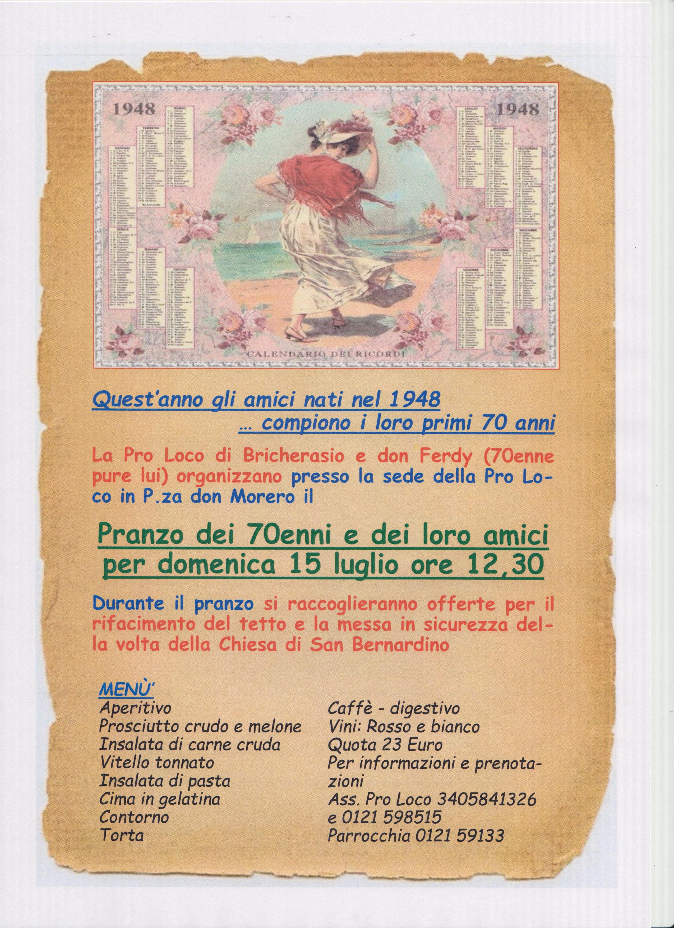 Quest’anno gli amici nati nel 1948 compiono i loro primi 70 anni. La Pro Loco di Bricherasio e don Ferdy (70enne pure lui) organizzano nella sede della Pro Loco in Piazza Don Morero per domenica 15 luglio alle ore 12,30 un pranzo solidale aperto a tutti i cittadini. Tutti i proventi verranno devoluti per il rifacimento del tetto e la messa in sicurezza della volta della Chiesa di San Bernardino.