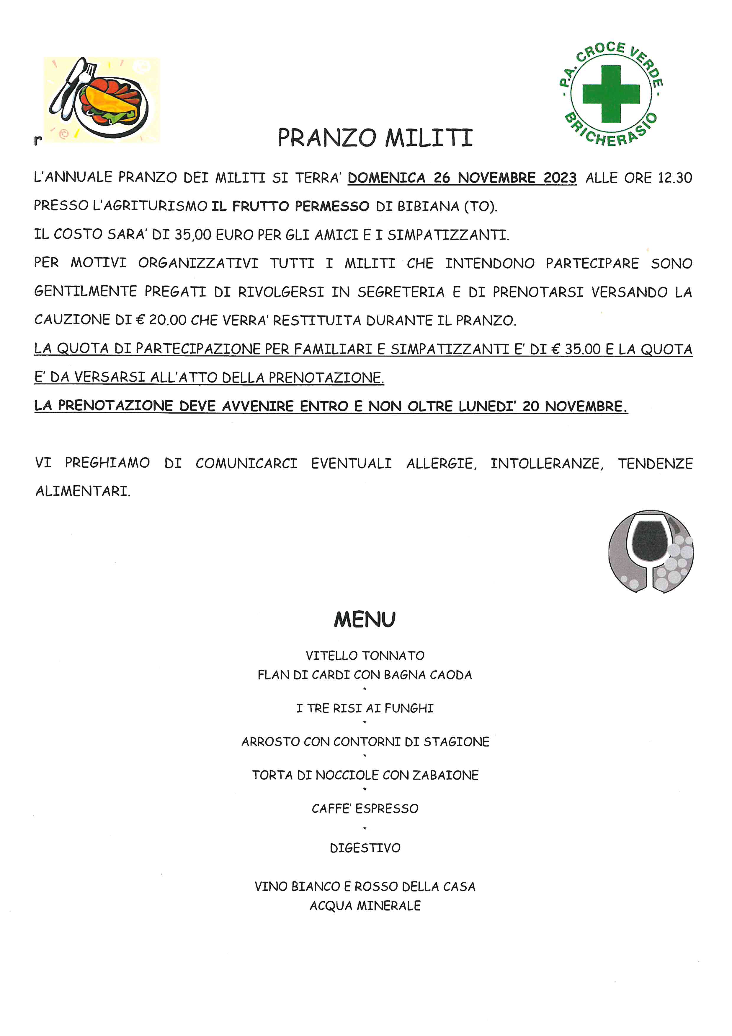 Domenica 26 novembre alle ore 12,30 si terrà presso l'Agriturismo Il Frutto Permesso di Bibiana l'annuale pranzo sociale della Croce Verde di Bricherasio. Per motivi organizzativi tutti i militi che intendono partecipare sono gentilmente pregati di rivolgersi alla segreteria presso la sede di Via XXV Aprile n. 9 e di prenotarsi entro lunedì 20 novembre, versando € 20 di caparra che sarà restituita durante il pranzo. La quota di partecipazione al ritrovo annuale per familiari e simpatizzanti è di € 35. La Croce Verde chiede di comunicare all’atto della prenotazione eventuali allergie, intolleranze e tendenze alimentari. Per maggiori informazioni telefonare al numero 0121/598790.