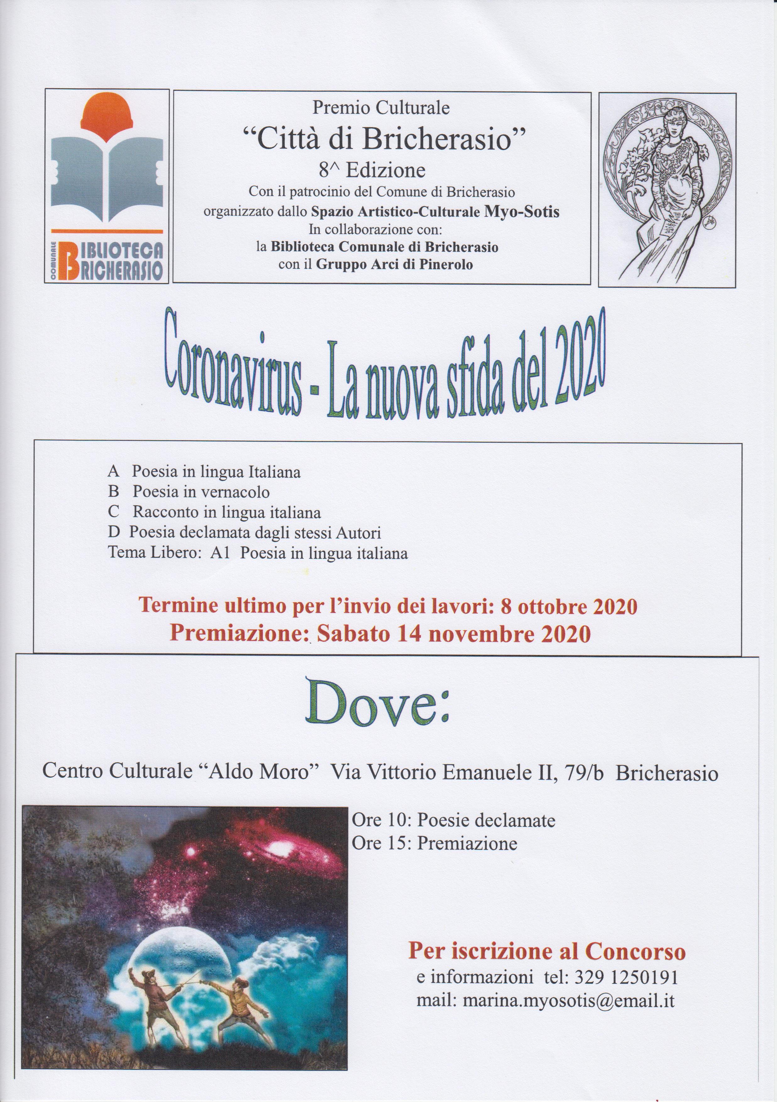 Lo Spazio Artistico-Culturale Myo-Sotis in collaborazione con la Biblioteca Comunale di Bricherasio ed il Gruppo ARCI di Pinerolo con il patrocinio del Comune di Bricherasio organizzano Il Premio Culturale “Città di Bricherasio", giunto all’8^ Edizione. Il Concorso letterario a tema Coronavirus, la nuova sfida del 2020 prevede le seguenti sezioni: poesia in lingua italiana, poesia in vernacolo, racconto in lingua italiana e poesia declamata dagli stessi autori. A tema libero pure la poesia in lingua italiana. Gli autori che si cimenteranno in veste di dicitori si ritroveranno sabato 14 novembre 2020 alle ore 10 al Centro Culturale “Aldo Moro” di Via Vittorio Emanuele II, 79/b Bricherasio e saranno invitati a declamare personalmente le loro composizioni di fronte alla giuria, il cui giudizio sarà insindacabile. La premiazione avverrà sabato 14 novembre 2020, alle ore 15, al Centro Culturale “Aldo Moro”. Ai primi tre classificati di ogni sezione saranno consegnati i premi, consistenti in diplomi, trofei, libri, coppe, medaglie. Per informazioni sul concorso e sui premi telefonare a Marina Flecchia al numero 329-1250191 oppure scrivere all’email: marina.myosotis@email.it