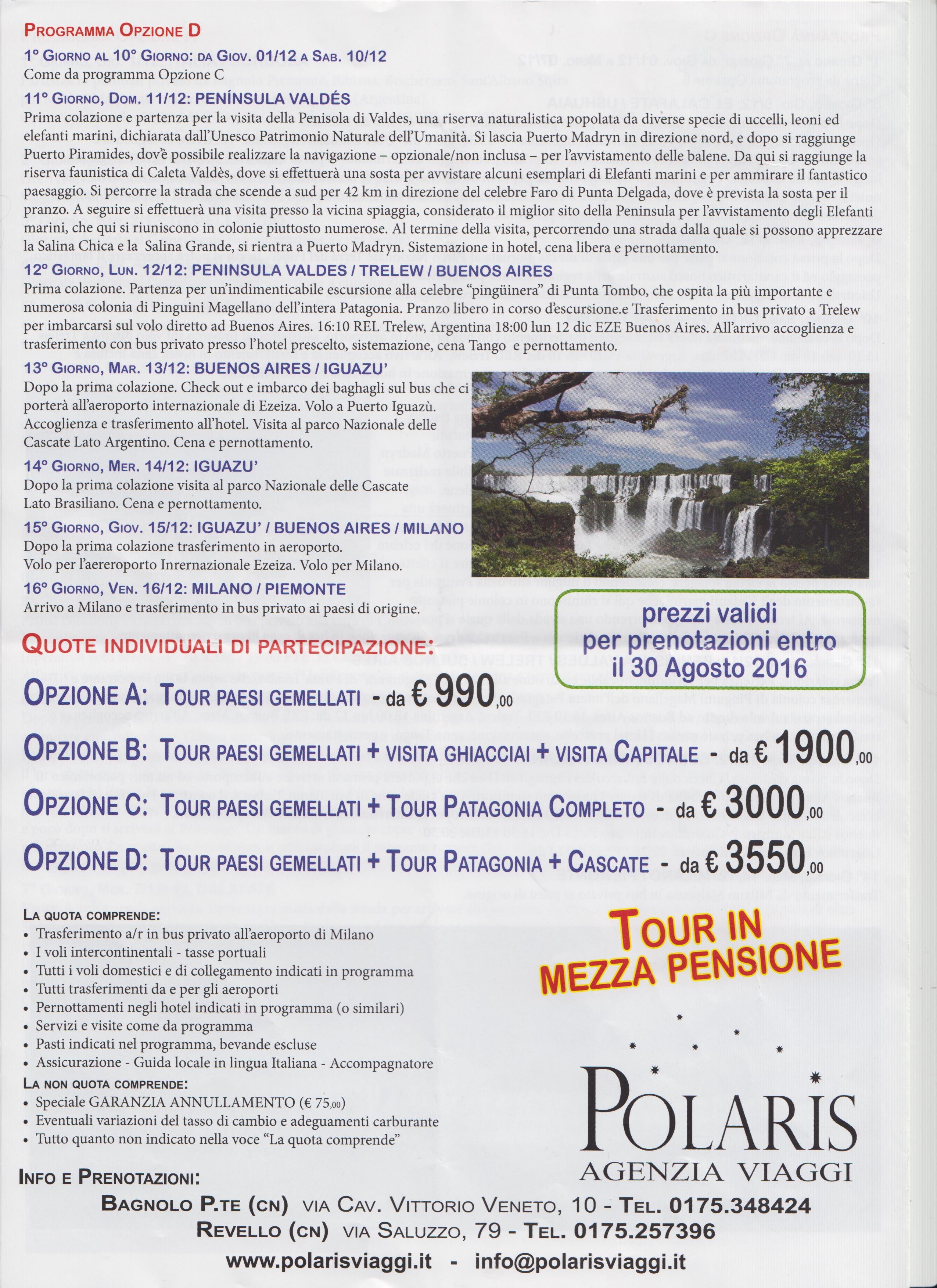 In occasione del 20° anniversario del gemellaggio tra Bagnolo Piemonte e Devoto, del 18° tra Bricherasio e Bell Ville e del 1° gemellaggio tra i paesi di Bibiana con Colonia Marina e di Sant'Albano di Stura con San Pedro. Le quote individuali di partecipazione variano da 990 € a 3550 € a seconda del tour scelto se la prenotazione viene effettuata entro martedì 30 agosto. Quattro le opzioni di viaggio proposte: il tour dei paesi gemellati costa 990 € per un soggiorno di 14 giorni e comprende il volo da Milano Malpensa a Cordoba, 3 giorni dedicati ai vari gemellaggi, una settimana libera, il rientro da Buenos Aires e il trasferimento nei paesi di provenienza. La seconda costa 1900 € dura 9 giorni e fino al quarto giorno ricalca la precedente, dal successivo si vola ad El Calafate, la "capitale" dei ghiacciai Argentini con una spettacolare navigazione per ammirare enormi iceberg, la steppa patagonica e le speci animali nel loro habitat naturale. L'ultimo giorno si và nella capitale Buenos Aires per una visita della città attraverso i suoi luoghi più significativi. Martedì 9 dicembre volo intercontinentale per Milano. La terza opzione di 14 giorni comprende un tour della Patagonia a partire dall'ottavo giorno, la prima settimana è uguale all'opzione precedente e prima della visita a Buenos Aires escursioni a Ushuaia al Parco Nazionale Terra del Fuoco, alla riserva naturalistica della Penisola di Valdes ed al faro di Punta Delgada. Prima di imbarcarsi per il rientro in Italia giornata da trascorrere nella capitale argentina. Il tutto a 3000 €. L’ultima variante di viaggio dura 16 giorni per un costo di 3550 € e dopo Buenos Aires si visita il Parco Nazionale delle cascate di Iguazu prima dal lato argentino e il giorno seguente da quello brasiliano. Informazioni e prenotazioni all'Agenzia Viaggi Polaris di Bagnolo Piemonte al numero 0175/48424