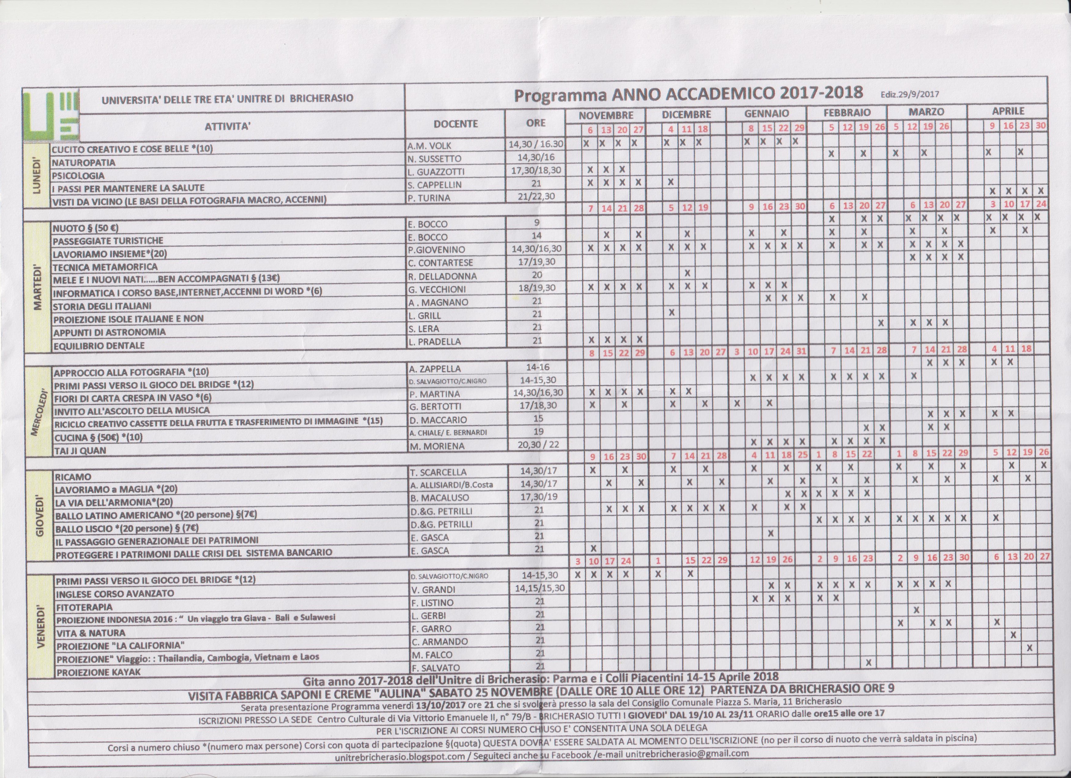 I passi per mantenere la salute, Cucito creativo, Visti da vicino, Lavoriamo insieme, Storia degli italiani, Fitoterapia, Appunti di astronomia, Equilibrio dentale, Bridge, Riciclo creativo cassette della frutta e La via dell’armonia sono le dieci nuove proposte del ventesimo anno accademico dell’Unitre di Bricherasio, presieduta fin dalle origini da Annamaria Garzena, che è vicina a chi vuole fruire del piacere e della ricchezza della cultura. Inaugurazione dell’anno accademico 2017/2018 venerdì 13 ottobre alle ore 21 nella Sala del Consiglio Comunale a Bricherasio. La quota associativa resta invariata a 25,00 € e dà diritto a partecipare a tutte le attività in programma. Le adesioni all’Università delle Tre Età di Bricherasio si ricevono nella sede, al Centro Culturale “Aldo Moro” di Via Vittorio Emanuele II, 79/B dalle 15.00 alle 17.00 di tutti i giovedì fino al 23 novembre. Aperta ad ogni età, l’Unitre offre ai suoi associati una ricca scelta tra cinque serate con proiezione di diapositive e filmati sulle Isole italiane, Indonesia, California, Oriente e Kayak, conferenze sul passaggio generazionale dei patrimoni e su come proteggersi dal sistema bancario, una serata a tema su mele e i nuovi nati, la visita guidata alla fabbrica di saponi e creme “Aulina” di Racconigi fissata per sabato 25 novembre, la gita di due giorni a Parma e i Colli Piacentini di metà aprile e ben ventotto corsi, poi altri eventi ed incontri che saranno ancora più interessanti e rinnovati nel corso dell’anno. Ricca è la scelta dei corsi adatti a tutti che sono naturopatia, psicologia, nuoto, passeggiate turistiche, tecnica metamorfica, informatica, approccio alla fotografia, fiori di carta crespa in vaso, invito all’ascolto della musica, cucina, tai ji quan, ricamo, lavoriamo a maglia, ballo liscio e ballo latino americano, inglese e vita e natura, oltre ai dieci già citati. Tra le finalità dell’Associazione educazione, informazione, fare prevenzione nell’ottica di un invecchiamento attivo, aprendosi al sociale e al territorio, operando un confronto con le culture delle precedenti generazioni. Inoltre si propone di contribuire alla formazione culturale e sociale degli Associati, mediante l’attivazione di incontri su argomenti specifici.