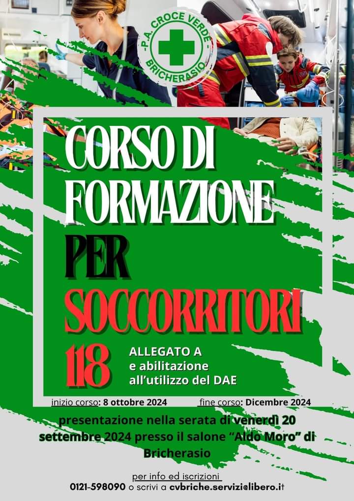 La Croce Verde di Bricherasio comunica che la sera di venerdì 20 settembre al Salone “Aldo Moro“ in Via Vittorio Emanuele II, 79/B si svolge la presentazione del corso per diventare volontari soccorritori, con l'abilitazione all' utilizzo del defibrillatore. Il corso, che parte martedì 8 ottobre con la fine prevista nel mese di dicembre, è aperto a tutti i cittadini maggiorenni e si articola in 50 ore teorico-pratiche e 100 ore di tirocinio protetto con certificazione e idoneità e per iscrizioni ed informazioni chiamare lo 0121/598090 oppure scrivere in via telematica a cvbriche.servizi@libero.it.
