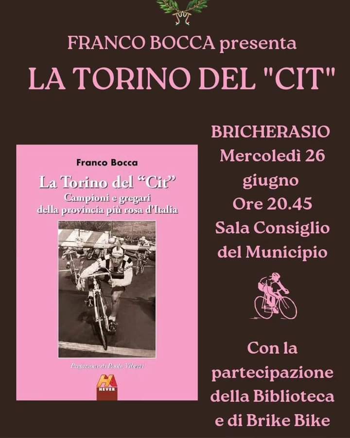 Mercoledì 26 giugno alle ore 20,45 il Comune di Bricherasio in collaborazione con la Biblioteca comunale e l’associazione ciclistica Brike Bike ospita, presso la Sala Consiglio del Municipio, Franco Bocca, giornalista per il ciclismo del quotidiano La Stampa ed autore del libro "La Torino del Cit. Campioni e gregari della provincia più rosa d'Italia", recentemente uscito per la Hever Edizioni di Ivrea. Bocca riscrive la storia di Torino e provincia in bicicletta: non solo Nino Defilippis detto il Cit, ma anche campioni e gregari, squadre e velodromi, corse e tappe, Giri d’Italia e Tour de France: 280 pagine tra ritratti e interviste, ritagli ed elenchi, foto e tessere.
