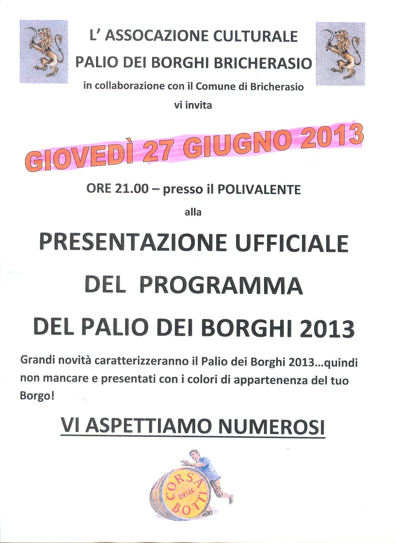 La neonata Associazione Palio dei Borghi di Bricherasio in collaborazione con il Comune di Bricherasio invita la cittadinanza giovedì 27 giugno alle ore 21,00 presso il Salone Polivalente di Via Vittorio Emanuele II alla presentazione ufficiale del programma del Palio dei Borghi 2013 con grandi novità che caratterizzeranno l’evento. Si raccomanda di presentarsi con i colori di appartenenza dei borghi.