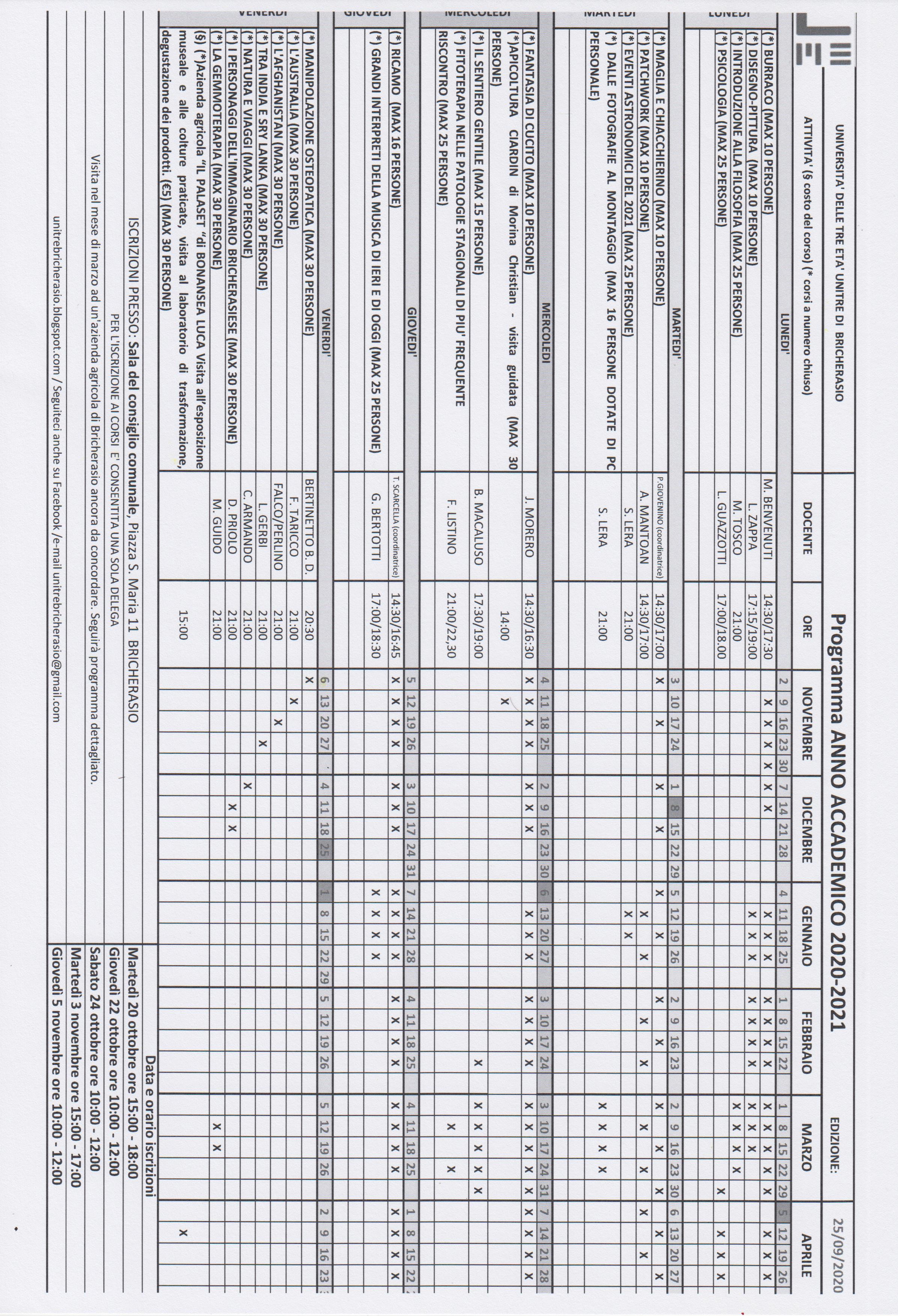 La buona notizia è che le attività dell’Unitre di Bricherasio riprendono a novembre e si riparte dalla sede storica dell’Associazione, il Centro Culturale “Aldo Moro” di Via Vittorio Emanuele II, 79/B dove si accettano le iscrizioni al ventitreesimo anno accademico dell’Associazione bricherasiese nei giorni di giovedì 22, sabato 24 ottobre e giovedì 5 novembre dalle ore 10 alle 12 mentre martedì 3 novembre si raccolgono le adesioni dalle ore 15 alle 17. Una grossa soddisfazione è che la quota associativa d’iscrizione all’Associazione non è mai aumentata nel corso di tutti gli anni e per l’anno accademico 2020/21 si riduce per la pandemia, per gli associati che l’anno scorso non hanno potuto terminare le lezioni la tessera costa 15 € e per gli eventuali nuovi iscritti di 20 € e dà diritto alla frequenza di tutti i corsi mentre la partecipazione alle conferenze è libera. Per Annamaria Garzena, Presidente dell’Università delle Tre Età di Bricherasio dalla sua fondazione ritornare sui banchi è fondamentale “Seppur con molteplici difficoltà anche quest’anno siamo riusciti a presentare un programma di tutto rispetto anche se in ritardo ma oltre alle problematiche del Covid abbiamo avuto difficoltà nel poter utilizzare la nostra sede che è stata occupata da una classe della Scuola Primaria. E non siamo riusciti a stampare il nostro solito libretto verde e ad organizzare la serata di apertura dell’anno accademico ma seppure un po’ in sordina si riparte” inizia la Presidente sempre più determinata ad affrontare l’ostacolo Coronavirus che continua "Siamo fiduciosi che tutti rispetteranno le misure anticovid e che tutto andrà per il meglio, da parte nostra provvederemo, alla fine di ogni lezione, a sanificare gli ambienti utilizzati e sarà obbligatorio l'uso della mascherina. Felici di poter ricominciare aspettiamo entusiasti i partecipanti per un nuovo anno insieme ricco di conoscenze, esperienze e soprattutto di rapporti umani". Annamaria prosegue “La nostra è un'associazione totalmente fondata sul volontariato, un lavoro senza alcun compenso, ma che appaga profondamente. Desidero ringraziare tutti quelli che collaborano con me a dirigere l'associazione verso le sue finalità, agli iscritti che partecipano e rendono vive le nostre iniziative e ci spingono a ricercarne sempre altre e soprattutto i docenti che mettono a disposizione di tutti noi le loro conoscenze e competenze”. L’Unitre di Bricherasio da ventitre anni attiva sul territorio con lo scopo di contribuire alla trasmissione del sapere si è trasformata in luogo di incontro, scambio, crescita ed arricchimento personale ed aperta ad ogni età, l’Unitre offre ai suoi associati una ricca scelta tra sei serate con proiezione di diapositive e filmati ed uscite didattiche ad iniziare dalla serata sulla Manipolazione Osteopatica di Bartolomeo Davide Bertinetto, alla visita guidata all'Apicoltura Ciardin di Christian Morina, alle proiezioni sull’Australia di Federica Taricco, Wakhan Corridor Ai confini del tempo è il titolo della serata condotta da Mauro Falco e Valter Perlino che raccontano il loro viaggio in Afghanistan nella meravigliosa lingua di terra dell'Hidu Kush in Afghanistan, ora aperta ai turisti, dopo anni di chiusura per via delle guerre. Il ciclo di proiezioni si conclude con gli ultimi due incontri, Luciano Gerbi racconta l'India e lo Sri Lanka e Cristina Armando conduce la serata sulla Natura e viaggi che chiude il ciclo di conferenze con proiezione di diapositive e filmati. Una visita prevista ad aprile del 2021, all’azienda agricola “Il Palaset” di Luca Bonansea con visita all'esposizione museale e alle colture e al laboratorio di trasformazione con degustazione dei prodotti. Maglia e Chiaccherino, Fantasia di Cucito, Ricamo, Burraco, e due incontri sui Personaggi dell’immaginario alpino sono i corsi che partono a novembre e dicembre mentre le altre materie programmate per l'anno prossimo sono Disegno e pittura, Introduzione alla filosofia, Psicologia, Patchwork, Eventi astronomici del 2021, Il Sentiero Gentile, Fitoterapia nelle patologie di stagione, Grandi interpreti della musica di ieri e di oggi, e la Gemmoterapia e si ricorda che sia su facebook che all’indirizzo internet unitrebricherasio.blogspot.com si possono reperire informazioni utili sull’attività dell’Unitre di Bricherasio. Termina la Presidente “Da oltre venti anni l’Unitre occupa un posto speciale nella mia vita e penso in quella di molte altre persone, perché ci ha fatto incontrare amici con cui abbiamo condiviso interessi culturali, ma anche momenti di convivialità. Un nuovo anno di attività insieme ci attende, prepariamoci a ripartire”.