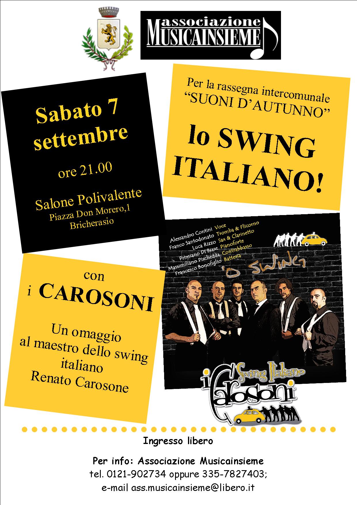 Per la rassegna intercomunale SUONI d'AUTUNNO, all'interno della 51^ Sagra dell’Uva bricherasiese "Lo swing italiano!" con “I Carosoni”, un omaggio al maestro dello swing italiano, Renato Carosone a cura del Comune e dell'Associazione Musicainsieme al Salone Polivalente, ingresso libero (info: 0121/902734 – 335/7827403).