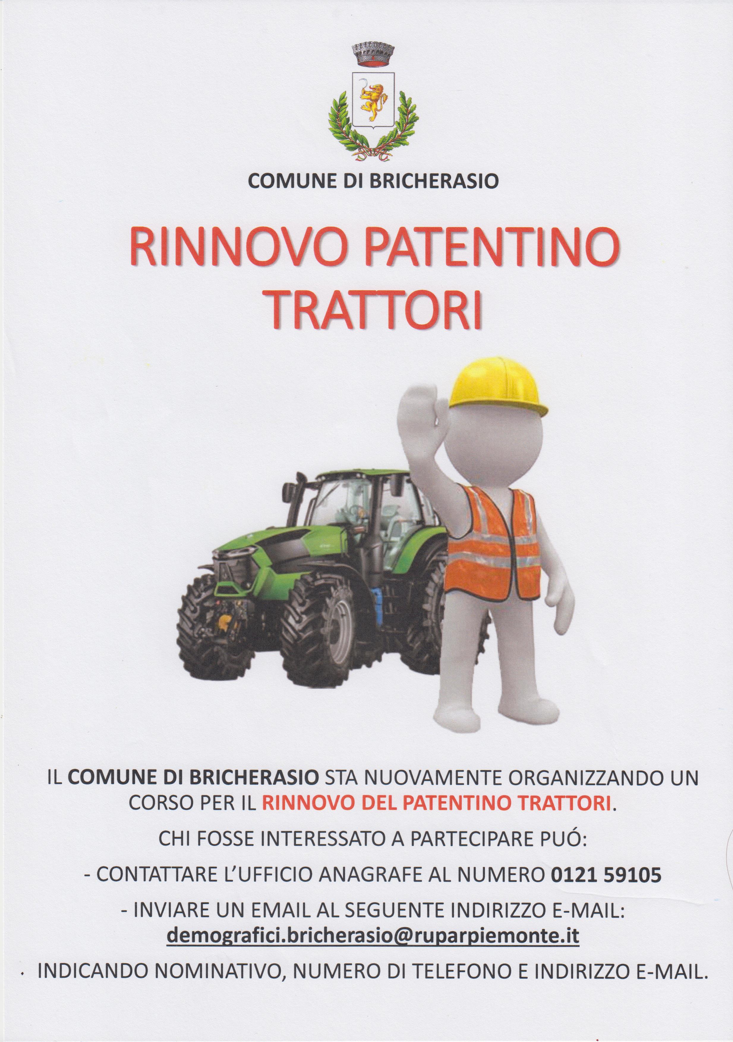 Il Comune di Bricherasio sta nuovamente organizzando il corso per il rinnovo del patentino per la guida dei trattori. Chi fosse interessato a partecipare può contattare l'Ufficio Anagrafe comunale allo 0121/59105 oppure via email all'indirizzo demografici.bricherasio@ruparpiemonte.it indicando nominativo, numero di telefono ed indirizzo email.