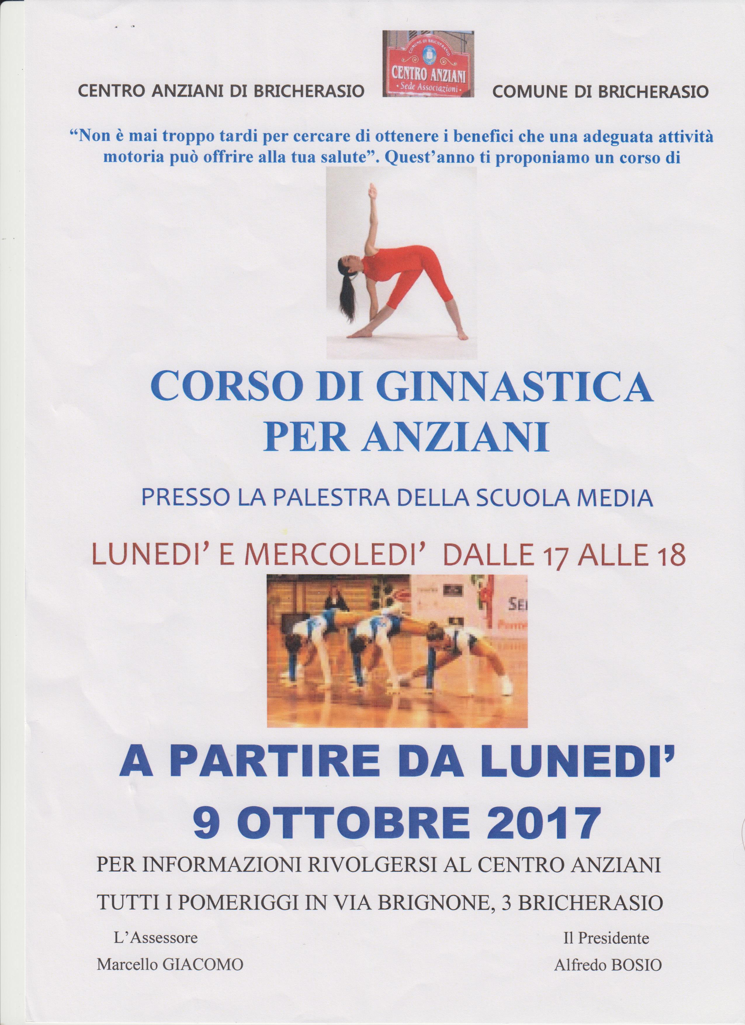 Il Centro Anziani di Bricherasio organizza il corso di ginnastica per anziani che si svolge nella palestra delle scuole medie il lunedì ed il mercoledì dalle 17 alle 18 a partire da lunedì 9 ottobre. Chi è interessato a partecipare e per informazioni rivolgersi tutti i pomeriggi, dalle ore 15,00 alle 18,00, presso il Centro Anziani di Via Brignone, 3 a Bricherasio.