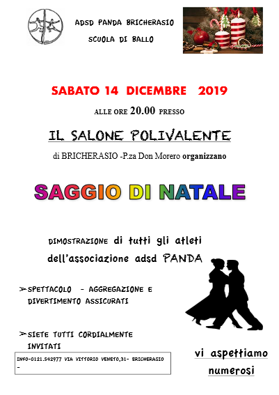 Sabato 14 dicembre alle ore 20 l'ADSD Panda di Bricherasio organizza, in collaborazione con il Comune, al Salone Polivalente di Piazza Don Morero, una serata augurale natalizia con dimostrazione di tutti gli atleti dell'Associazione con un saggio-spettacolo degli allievi dell'Associazione bricherasiese che si esibiscono in varie specialità della Danza Sportiva. Aggregazione e divertimento sono assicurati e tutti sono invitati a ballare alla serata ad ingresso gratuito. La manifestazione rientra negli appuntamenti della XXI edizione del Natale a Bricherasio.