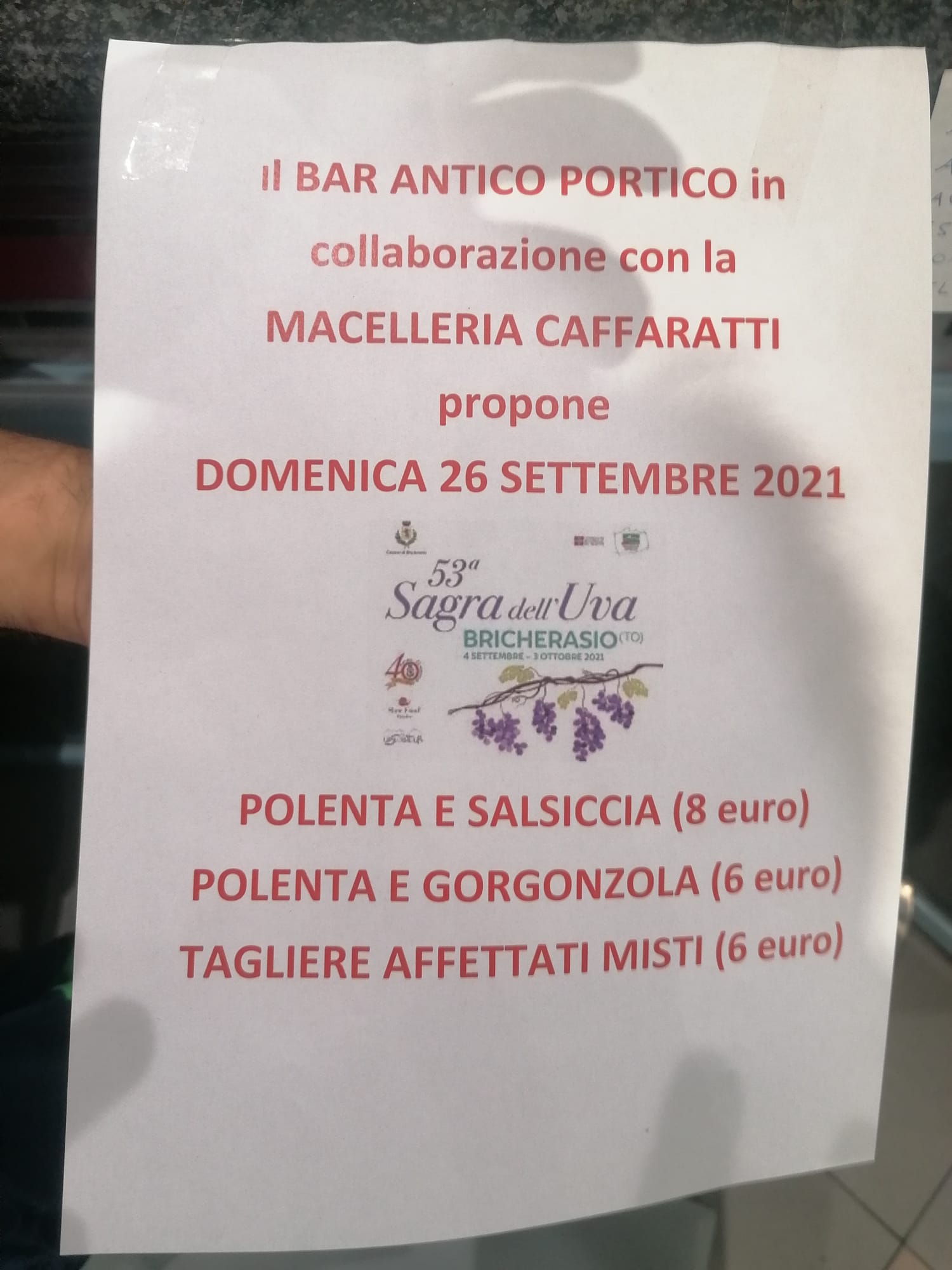 La Pro Loco organizza dalle 19 di sabato 25 la cena (da asporto o con consumazione in loco all'aperto) a base di costine, salsiccia, patatine, agnolotti e tajarin nella propria sede in Piazza Don Morero. Prenotazione obbligatoria al numero 340/5841326. Domenica 26 dalle 12 “La Piazza del gusto... da asporto!” con agnolotti e tajarin della Pro Loco di Bricherasio ed i piatti della tradizione proposti da alcuni commercianti presso i propri esercizi: la macelleria Caffaratti ed il Bar Antico Portico propongono polenta con spezzatino e salsiccia o gorgonzola, la macelleria Lisdero & Marras carne cruda "alla Silvia" e antipasto caldo con salame cotto e crauti, la Gastronomia L’Appetito prepara sfornatino con fonduta, insalata di polpo e fritto misto di pesce. La Sorbetteria di P.za Castelvecchio pensa infine al dolce con bomboloni e zabajone.