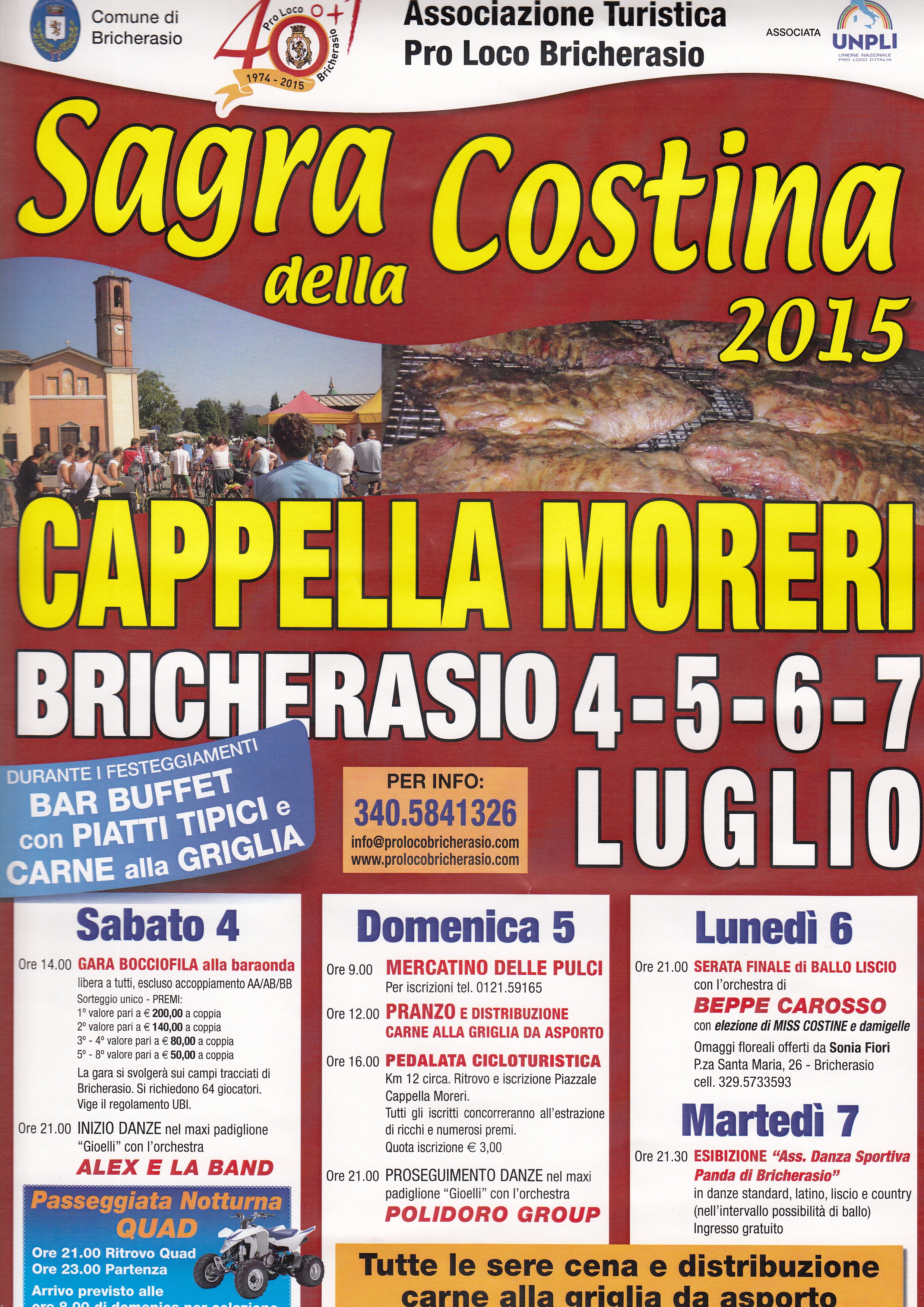La passeggiata notturna dei quad di sabato 4 luglio in collaborazione con il Quad team “Sempe ed travers” viene riproposta pure quest’anno nella 41^ “Sagra della costina” di Cappella Moreri organizzata come sempre dall’Associazione Turistica Pro Loco di Bricherasio nei giorni di sabato 4, Domenica 5, lunedì 6 e martedì 7 luglio. Il sabato alle ore 14,00 presso i campi bocciofili tracciati di Piazza Santa Maria del capoluogo bricherasiese, classica gara bocciofila alla baraonda libera a tutti con sorteggio unico. Il primo premio è di valore pari a 200 € per coppia per scendere a 140 € ai secondi, a 80 € ai terzi e ai quarti classificati vanno 50 €. Alle 19,30 distribuzione di carne alla griglia che prosegue per tutte le sere della festa con bar buffet e piatti tipici e alle ore 21,00 inizio danze nel maxi padiglione “Gioelli” con l’orchestra “Alex e la band”. Domenica 5, dopo l’arrivo dei quad dalla passeggiata notturna previsto intorno alle ore 8,00 dalle 9,00 tradizionale mercatino delle pulci e per iscriversi occorre telefonare allo 0121/59165. Pranzo di costine dalle ore 12,00 e alle 16,00 l’immancabile pedalata cicloturistica di circa 12 km con ritrovo ed iscrizioni sul posto dove tutti i partecipanti con la quota di adesione di 3 € concorrono all’estrazione di ricchi e numerosi premi e dalle 19,00 comincia la distribuzione di carne alla griglia. Alle ore 21,00 proseguimento danze con l’orchestra “Polidoro Group”. Lunedì 6 la festa continua con l’assado a partire dalle 19,00 e a seguire serata finale di ballo liscio con l’Orchestra “Beppe Carosso” e l’elezione di Miss Costine e damigelle con un gradito omaggio floreale offerto da Sonia Fiori. Il martedì si svolge, con la cena di chiusura della sagra, alle 21.30 un esibizione ad ingresso gratuito dell’Associazione Danza Sportiva Panda di Bricherasio in danze standard, latine, liscio e country con possibilità di ballare nell’intervallo dello spettacolo