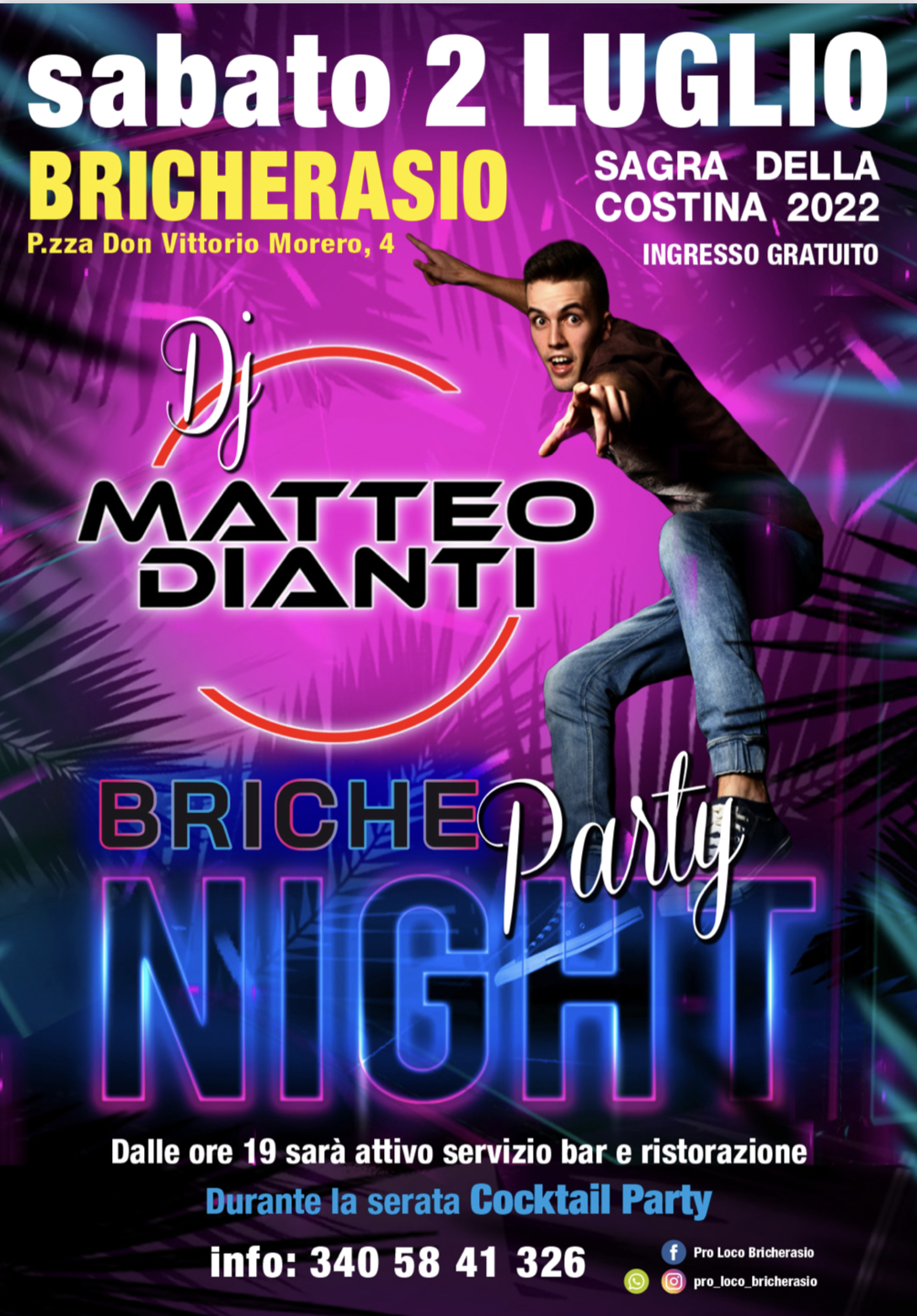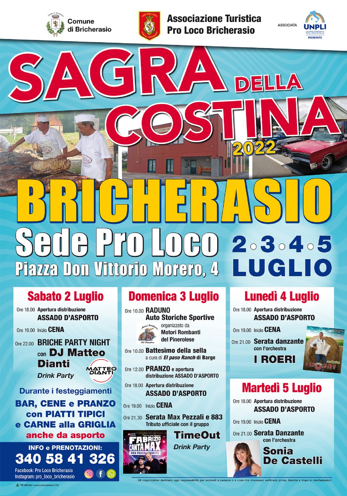 L’Associazione Turistica Pro Loco di Bricherasio organizza per sabato 2, domenica 3, lunedì 4 e martedì 5 luglio presso la sede di Piazza Vittorio Morero 4 la tradizionale “Sagra della costina”, giunta a quasi cinquanta edizioni e, causa Covid, spostata da alcune edizioni da Cappella Moreri, storica location che negli anni ha fatto diventare la manifestazione la più importante dell’Associazione bricherasiese. Centinaia di persone coinvolte per quattro giornate, durante le quali si cuociono montagne di costine, patatine, agnolotti, antipasti vari, dolci, e alla sera quattro salti sul ballo a palchetto con rinomate orchestre.